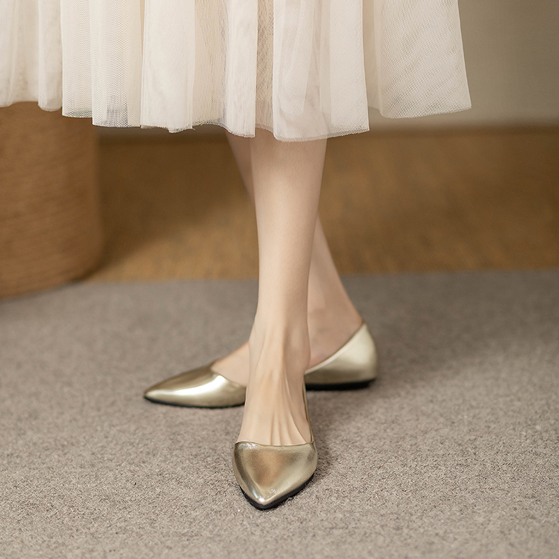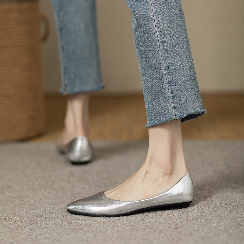 一脚蹬平底浅口银色百搭小皮鞋 法式 新款 女2025年夏季 尖头真皮单鞋
