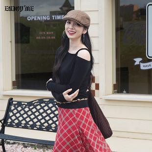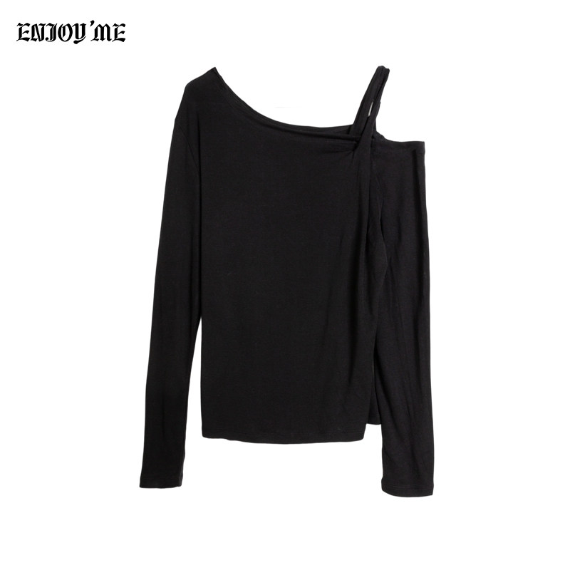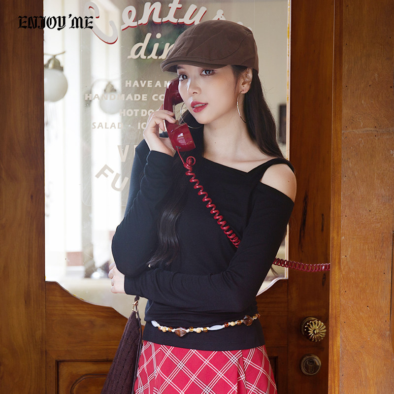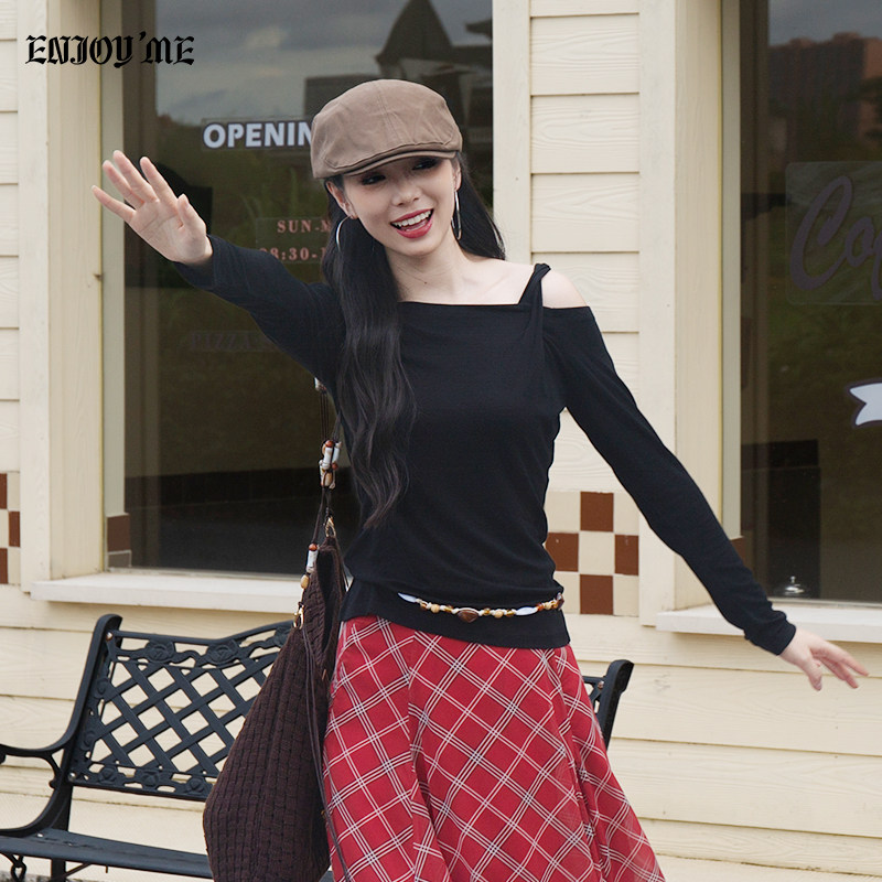T恤女2025夏季 甜辣斜领露肩长袖 单肩带上衣 美式 ENJOYME商场同款