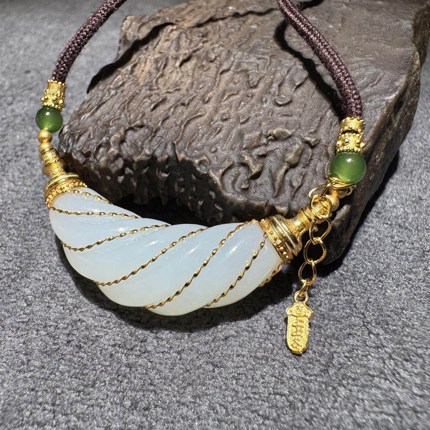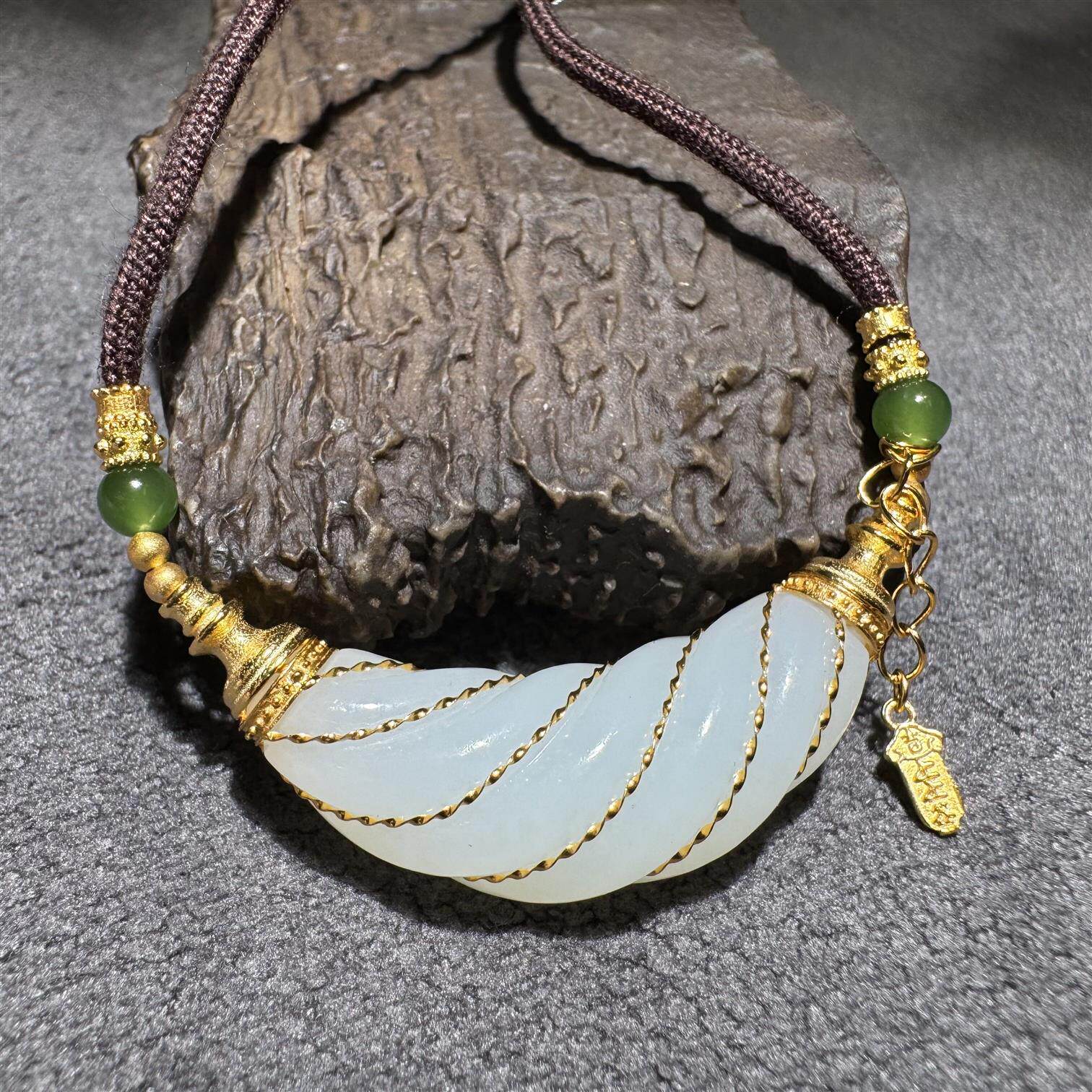 方言新疆和田玉老坑且末高脂高糯白玉银镶缠丝牛角包路路通项链S6
