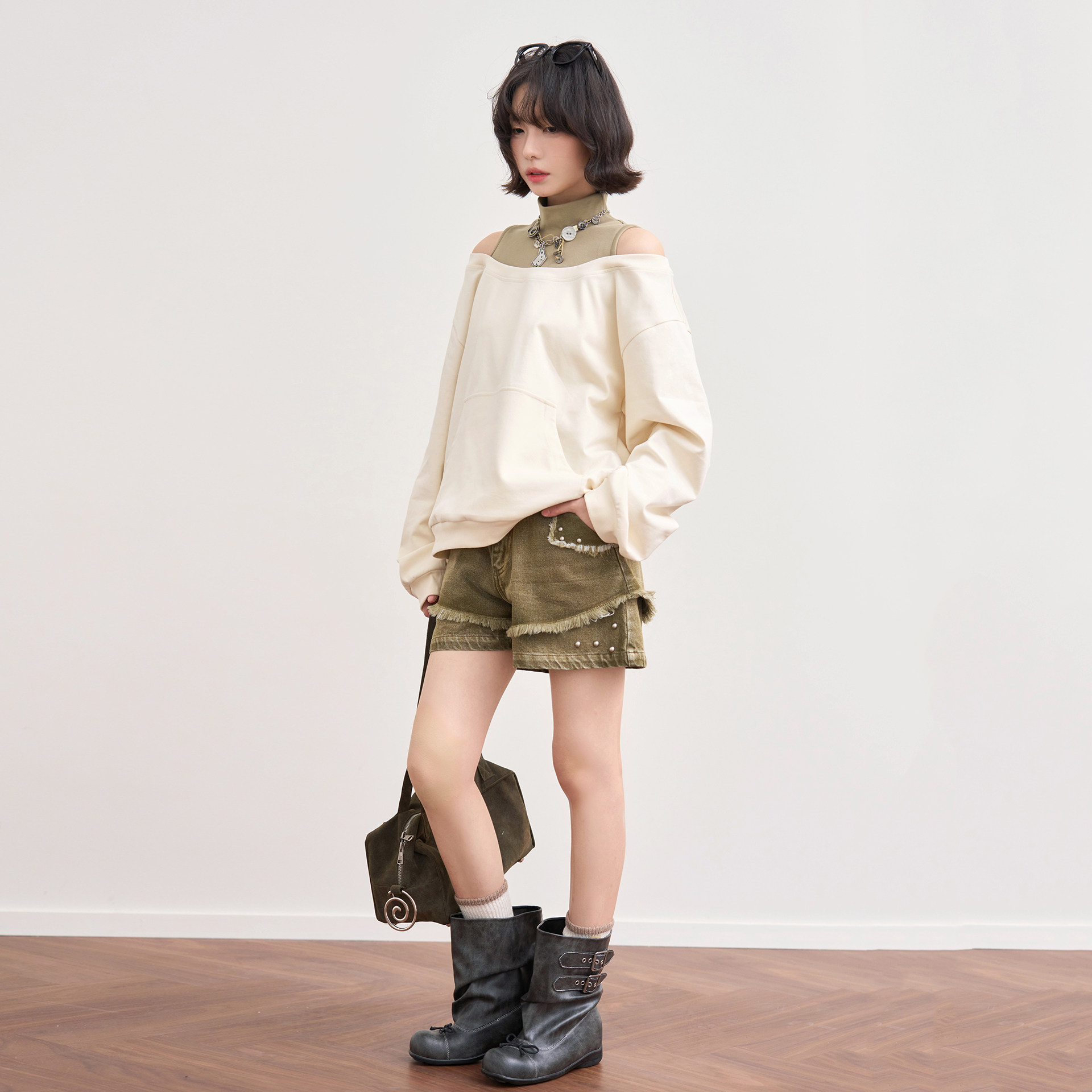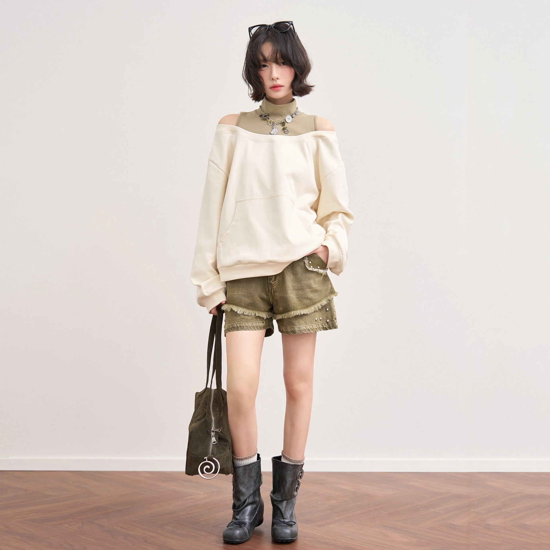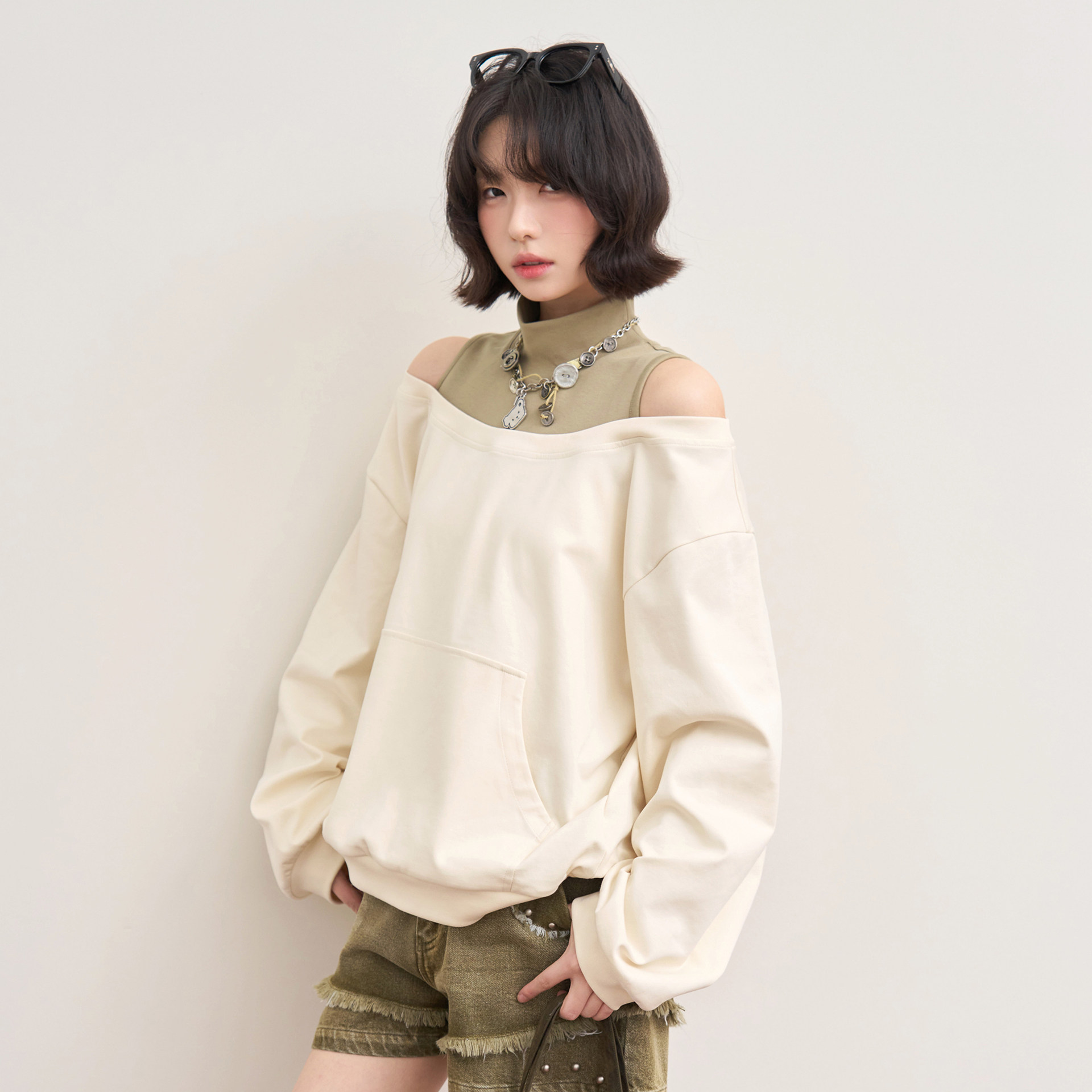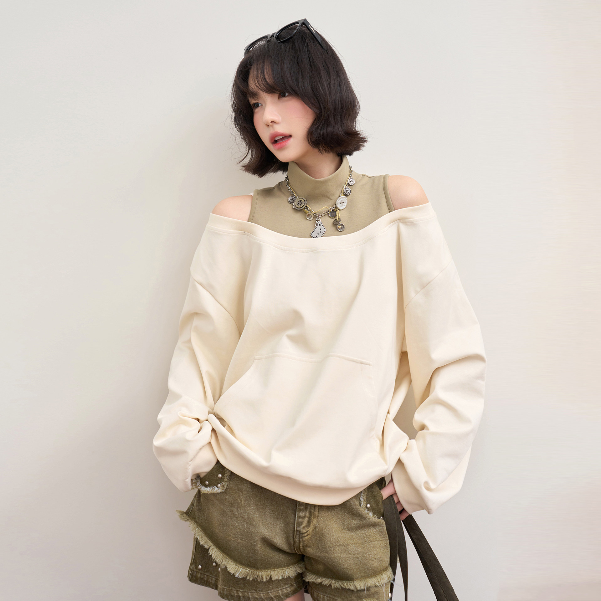 万有引力博物馆「一览风月」拼接撞色小高领露肩卫衣女早春款 上衣