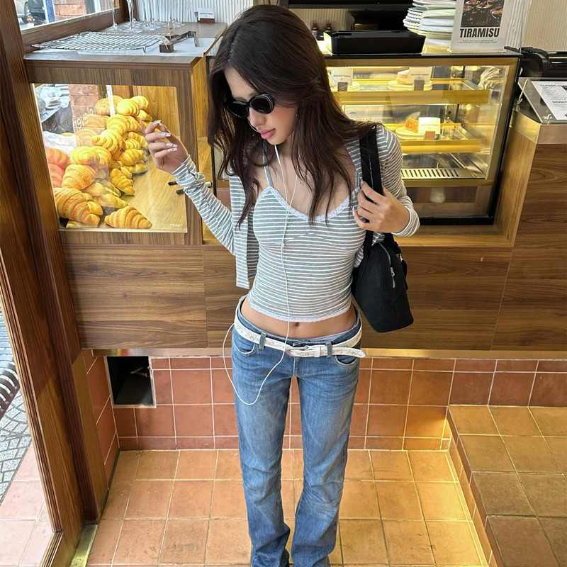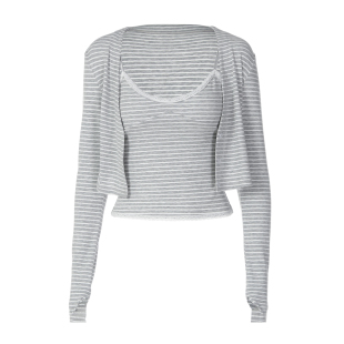 外套两件套装 开衫 女 长袖 shemoda辣妹风条纹印花蕾丝拼接吊带背心