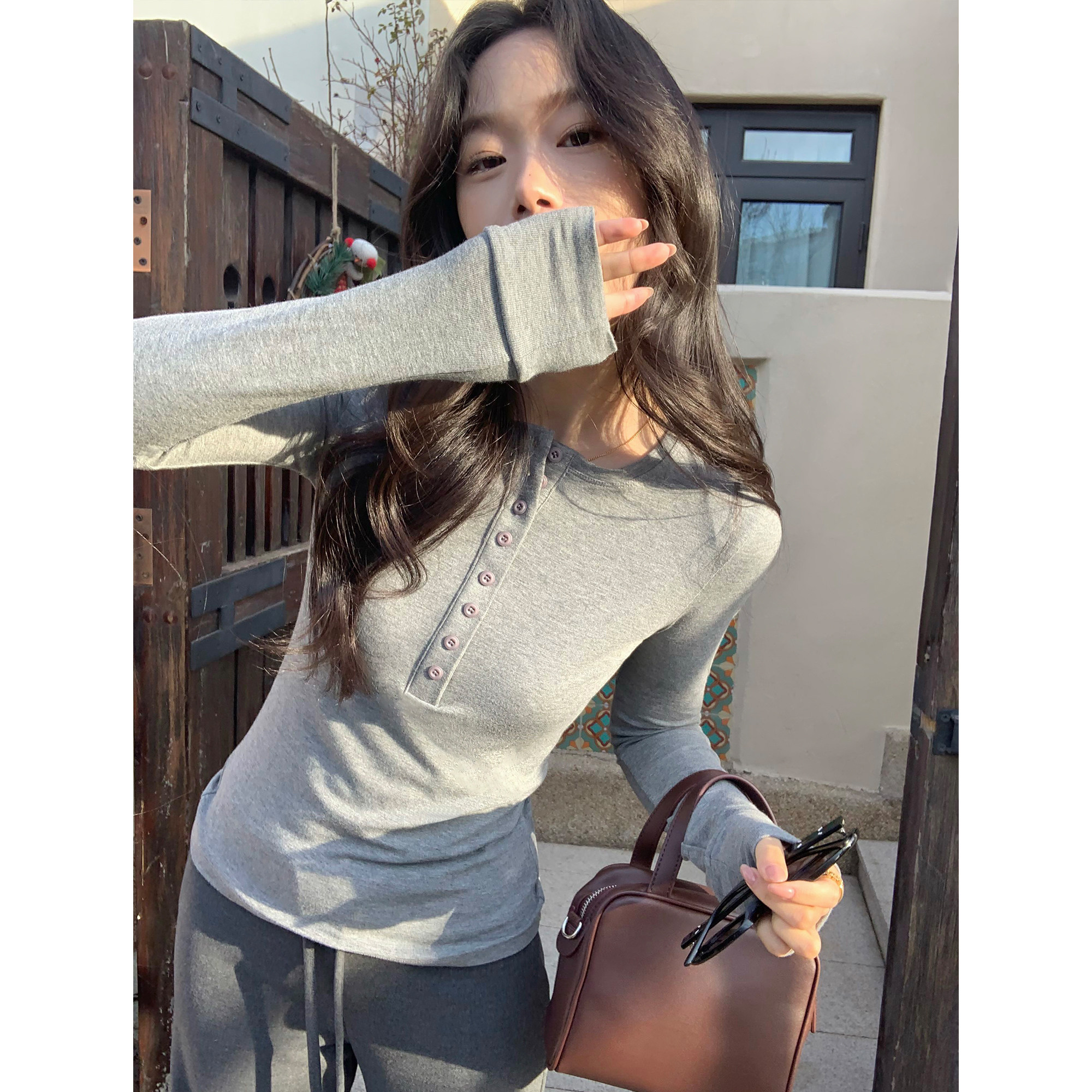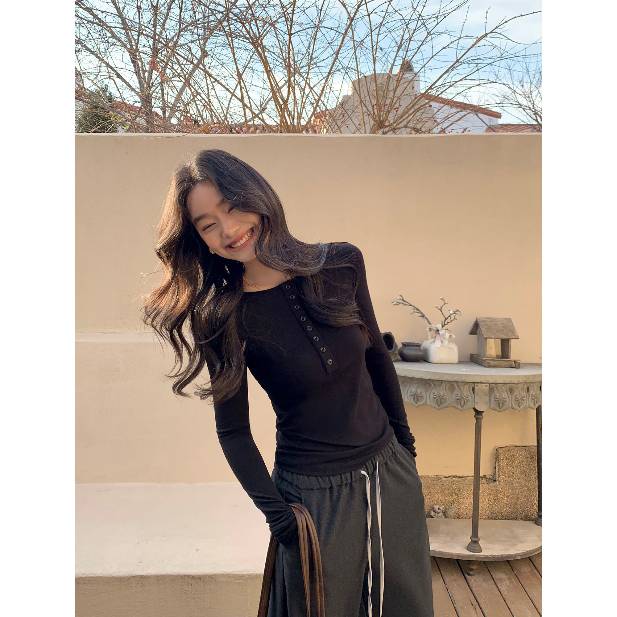t恤上衣 女气质内搭长袖 pusumede轻韩日常 黑色圆领排扣打底针织衫
