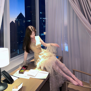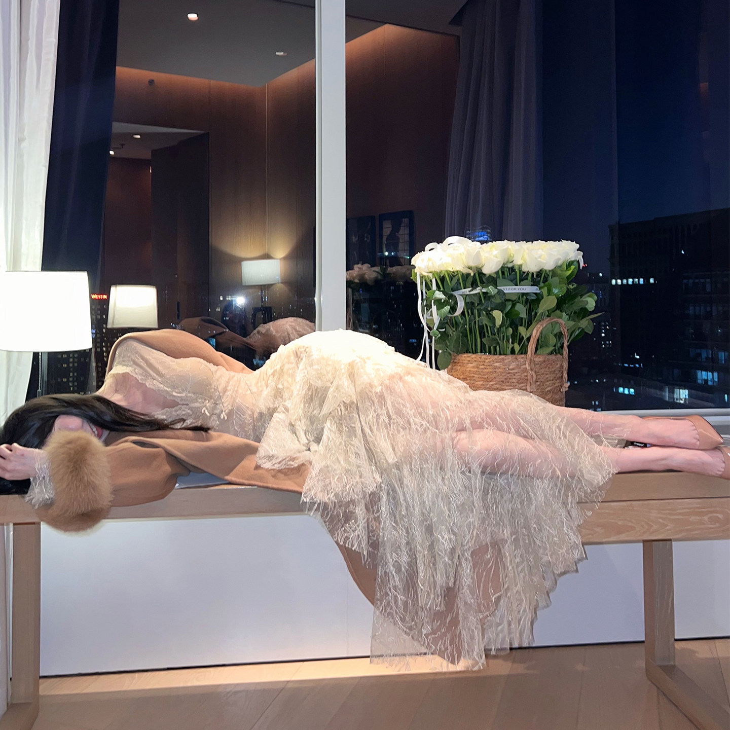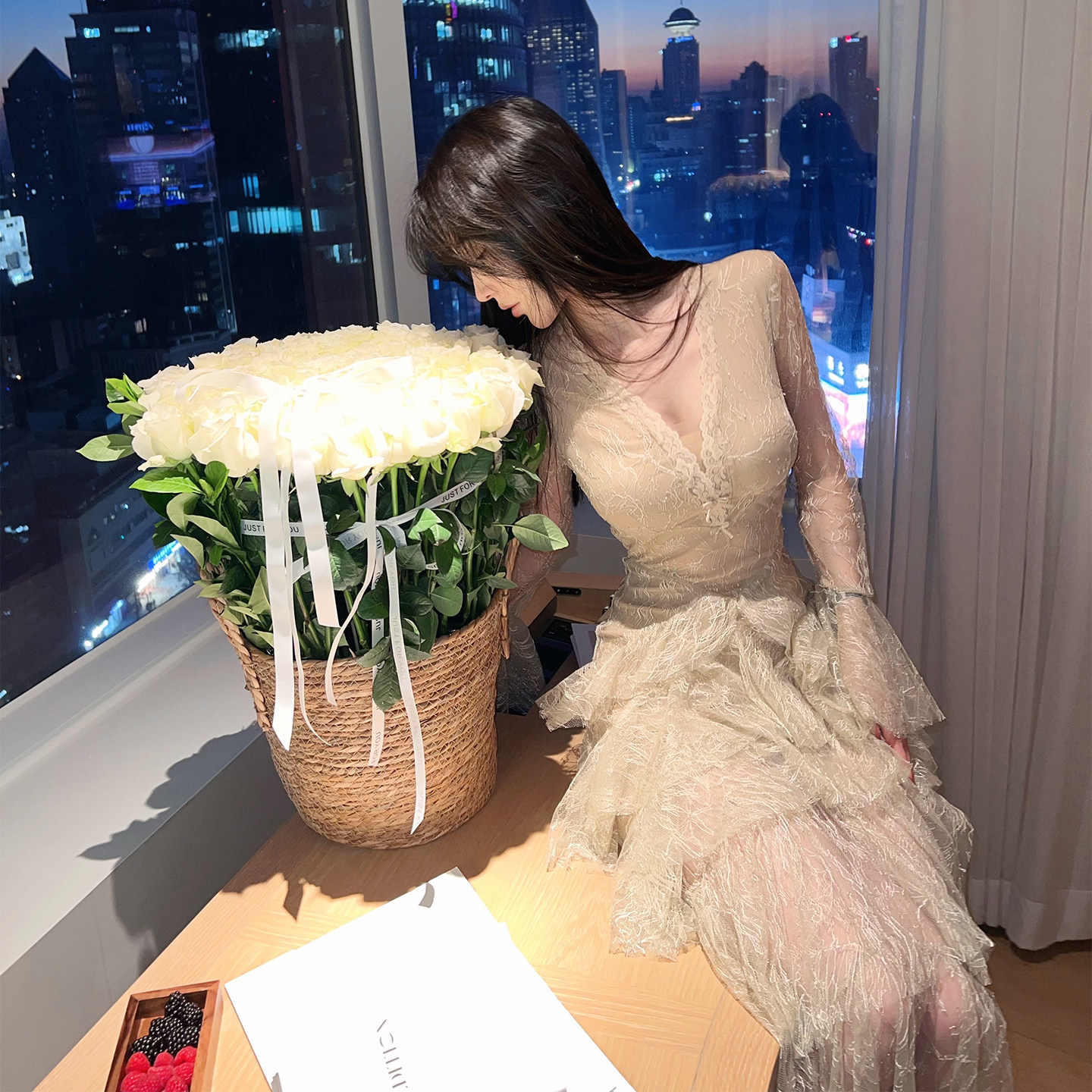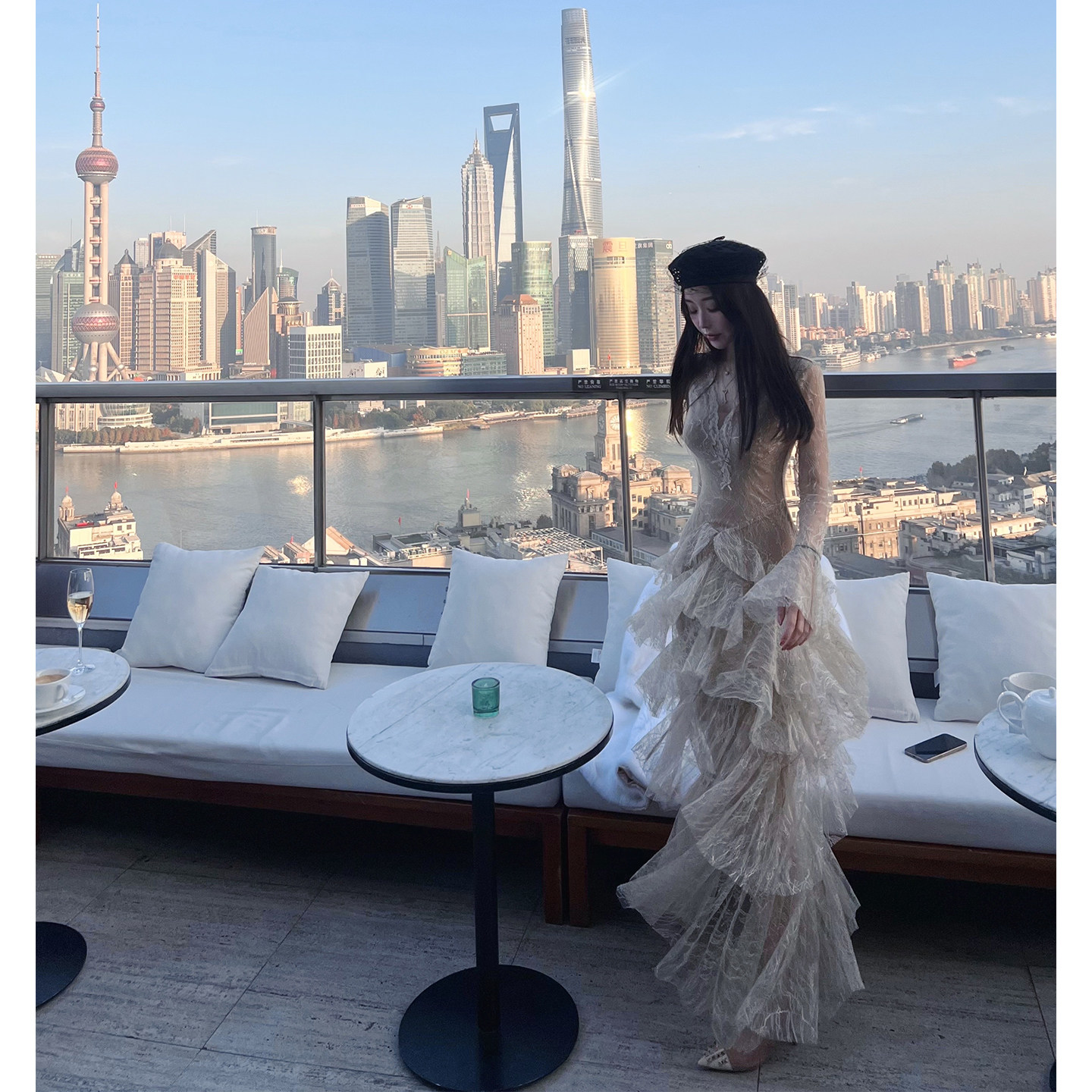 优雅气质裸色性感V领收腰立体蕾丝层叠蛋糕裙摆连衣裙 绮梦
