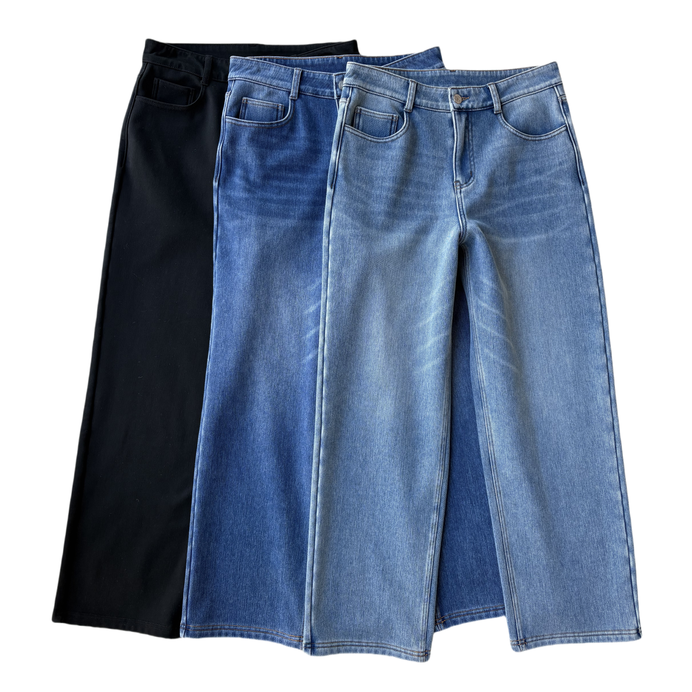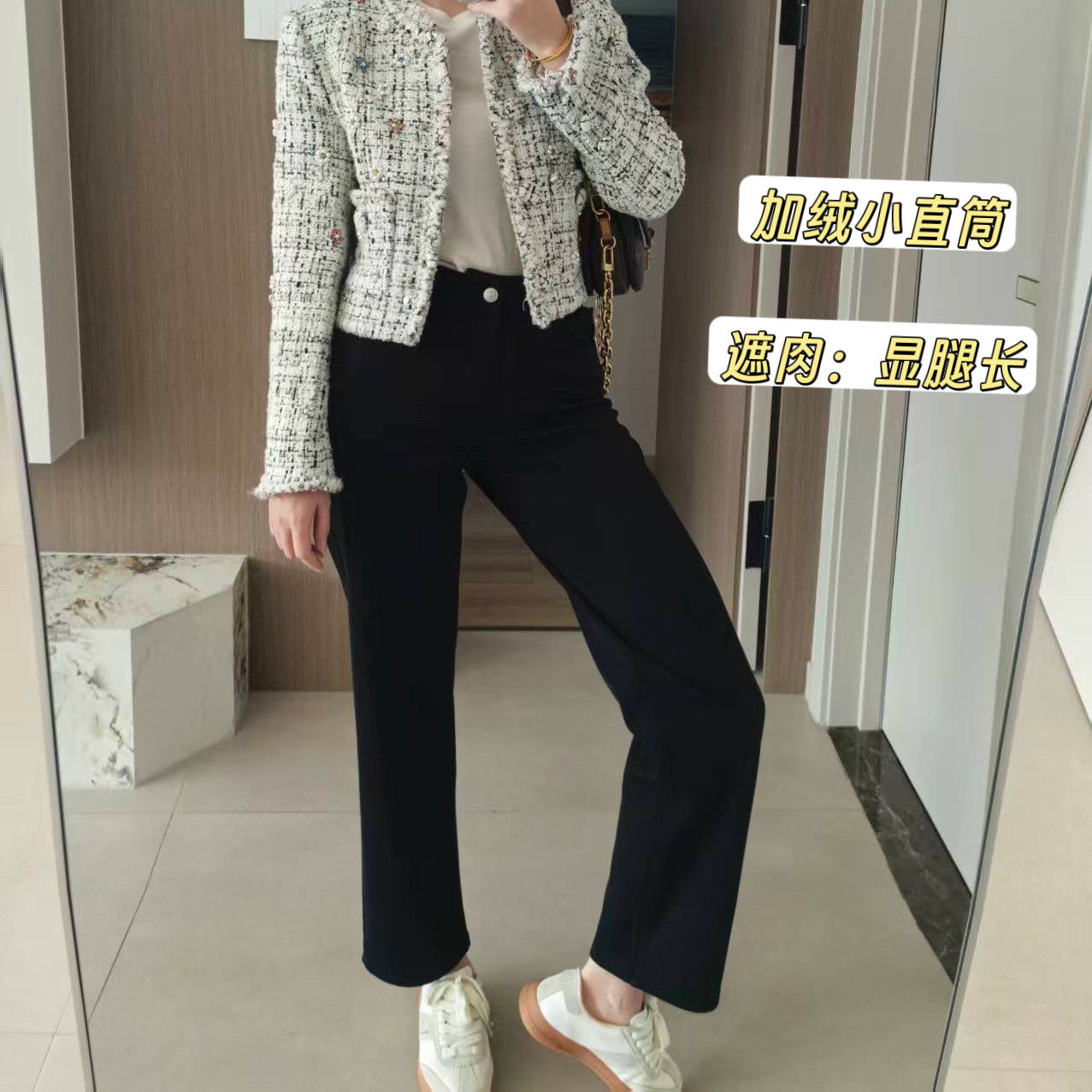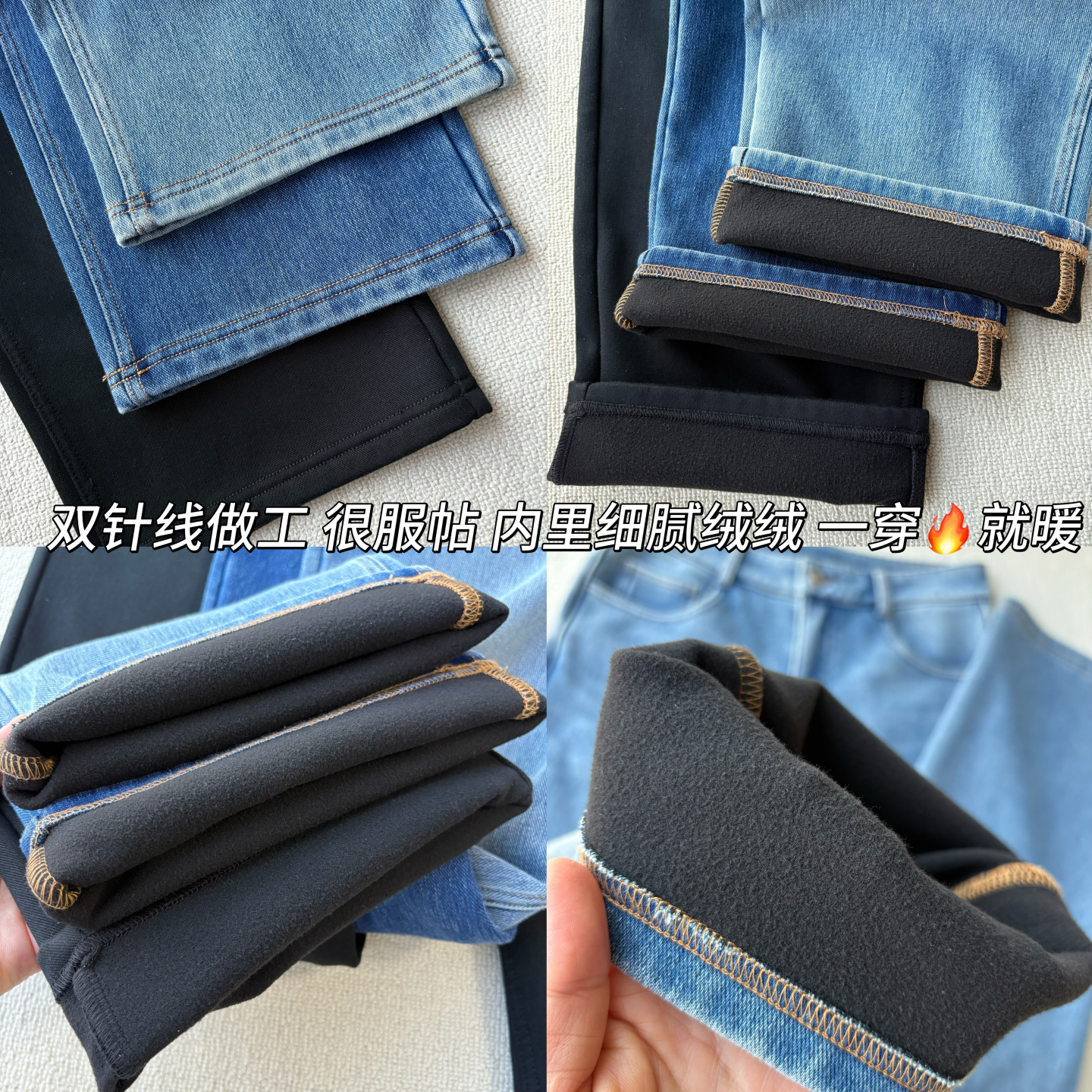 发热加倍抗寒四面弹力加绒保暖一体加绒窄版 高腰针织软牛仔直筒裤