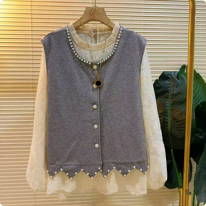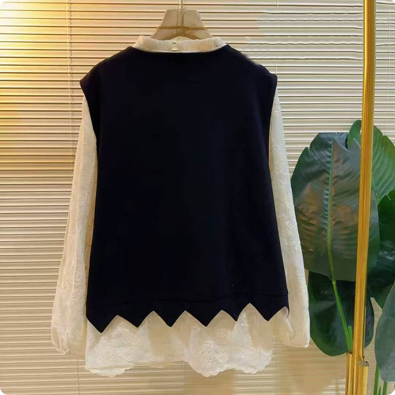 胖mm圆领拼接蕾丝马甲打底衫 2025秋季 女装 大码 上衣两件套 洋气新款
