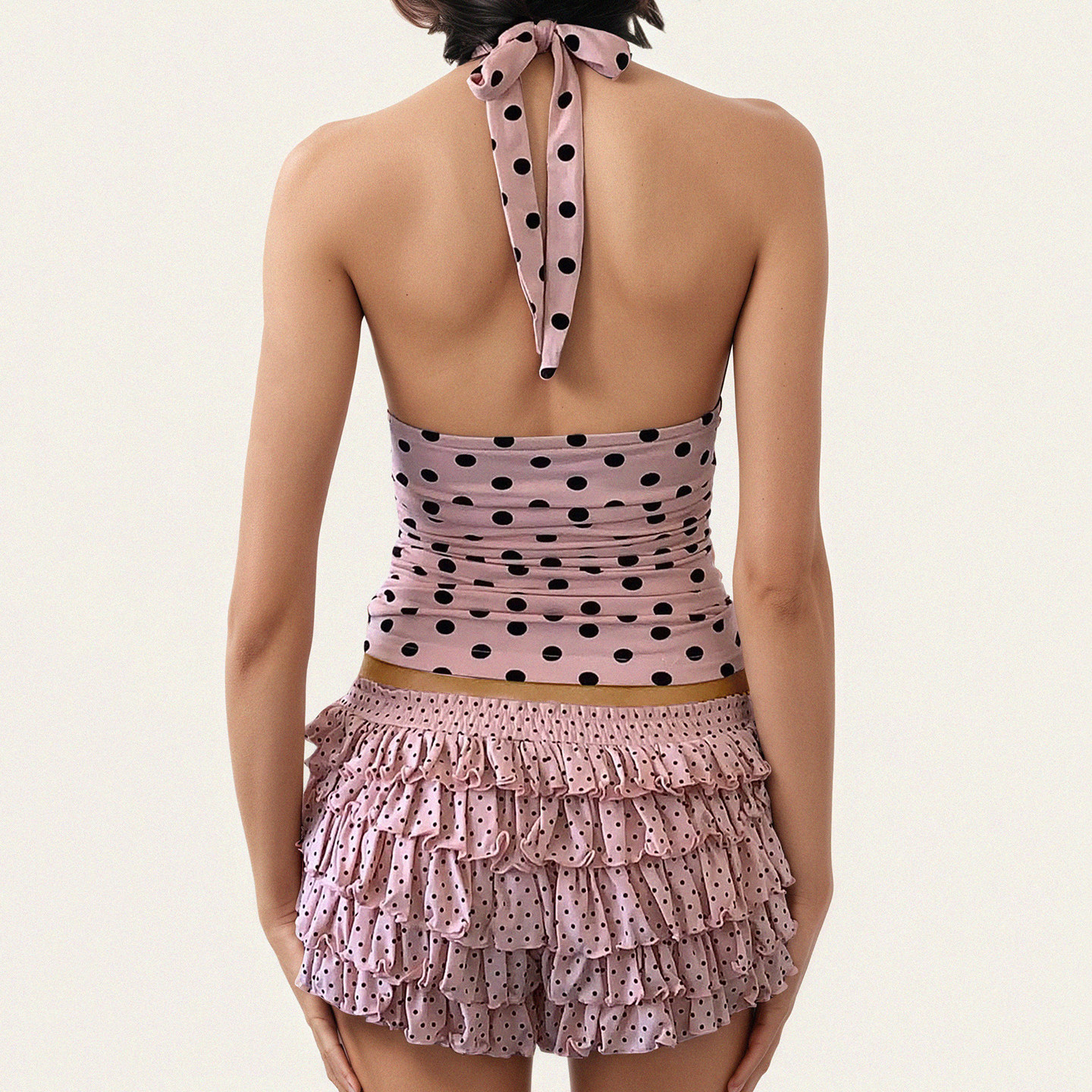 复古粉色波点挂脖吊带背心上衣低腰半身短裙两件套装 FUNOFF 法式