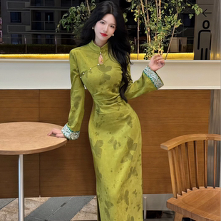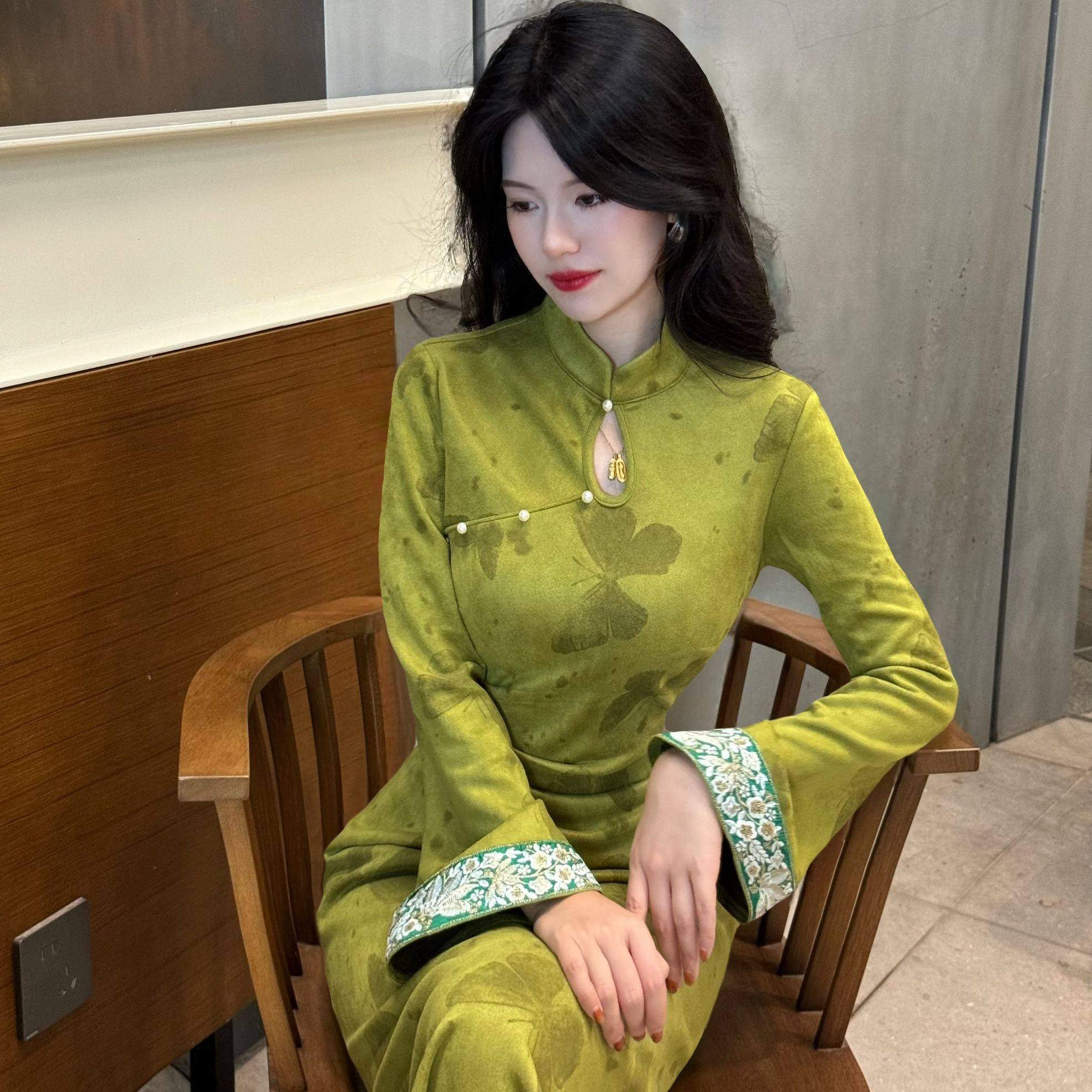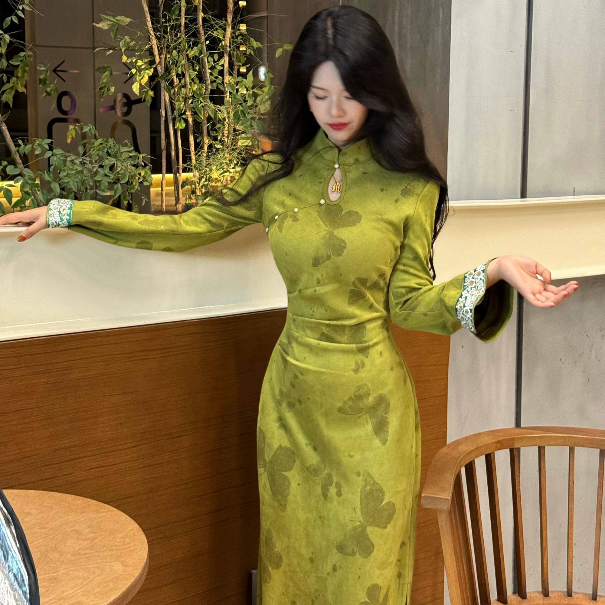LHMknk1画报夫人原创自制高级秋冬麂皮绒显白新中式 蝶绿 文艺旗袍