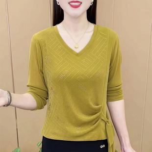 V中袖 弹力装 小衫 钻上衣领烫显瘦系带早秋洋气气质妈妈 芭拉婷