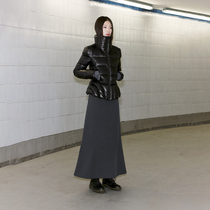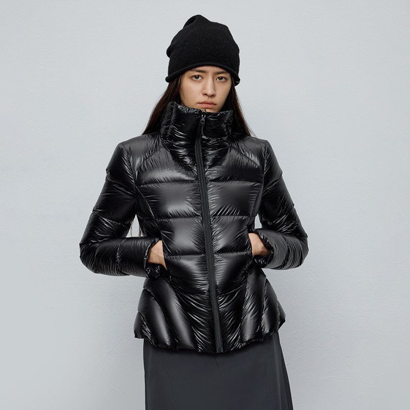 黑色修身 亮面无胆防绒面料 2025冬季 运动 收腰羽绒服女 半圆女装