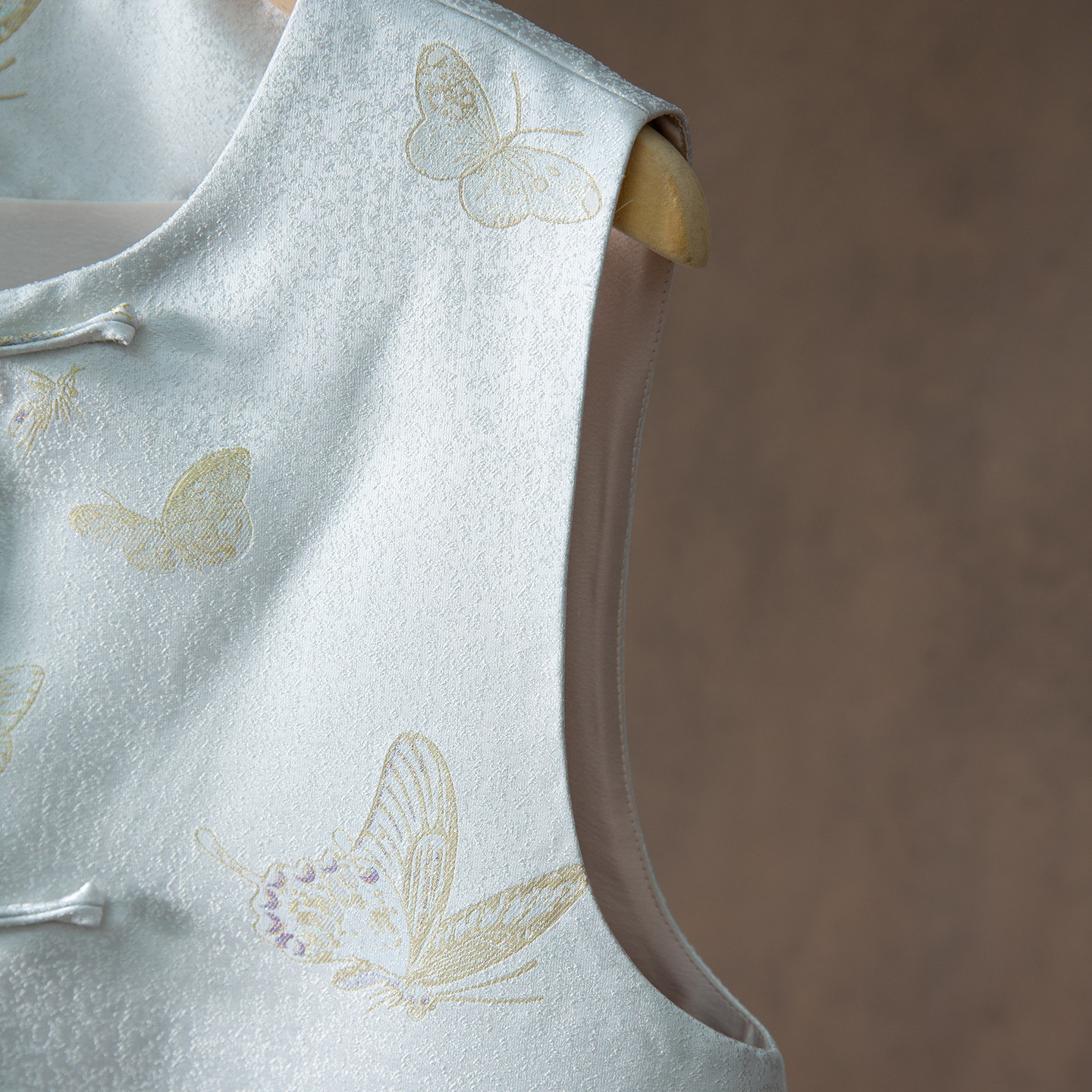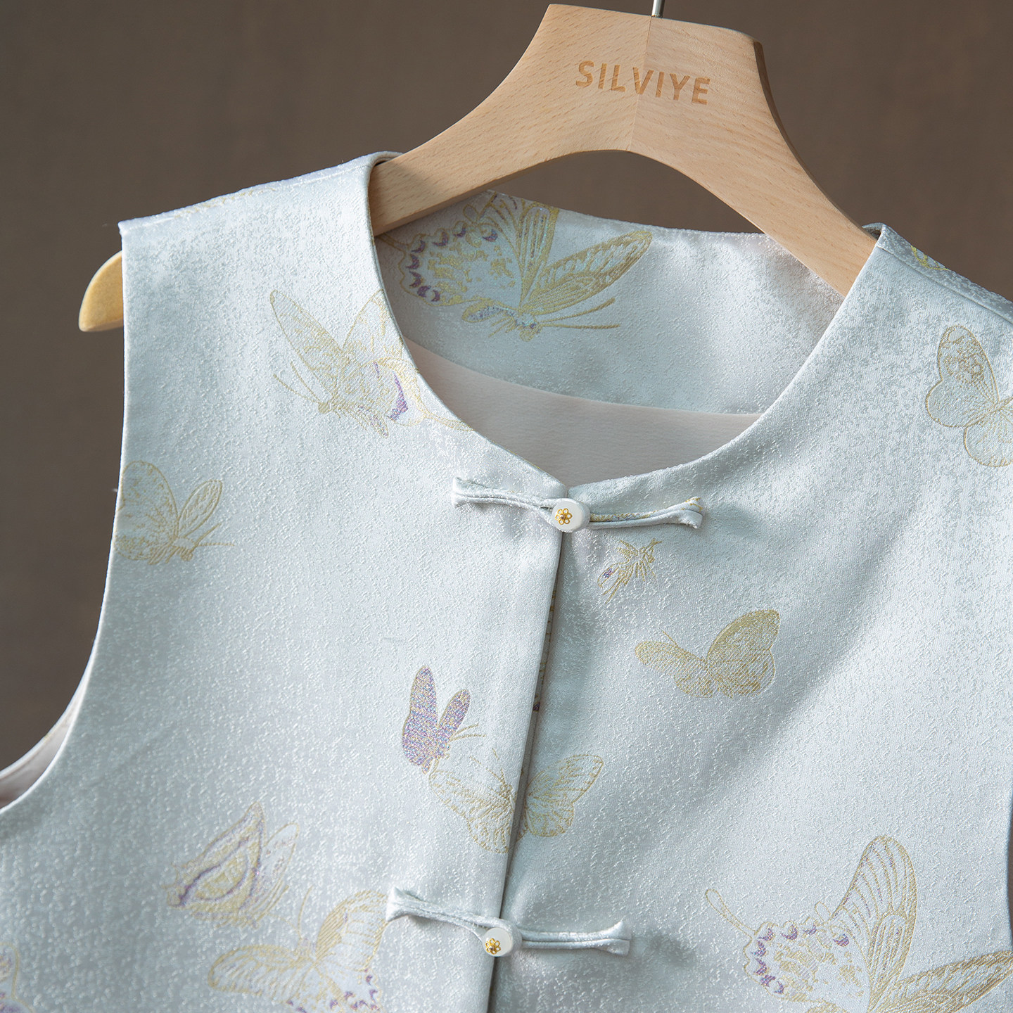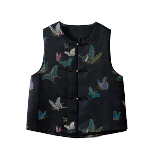 一丝牵100%桑蚕丝国风蜀锦盘扣真丝马甲女外穿V领无袖 上衣春 开衫