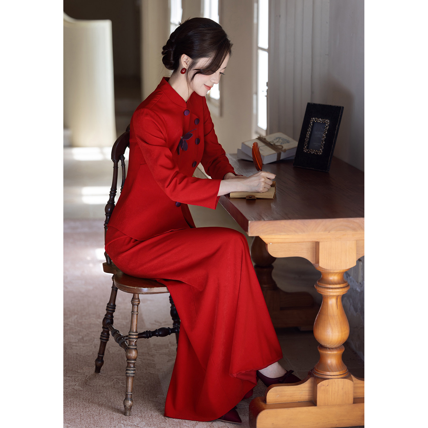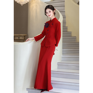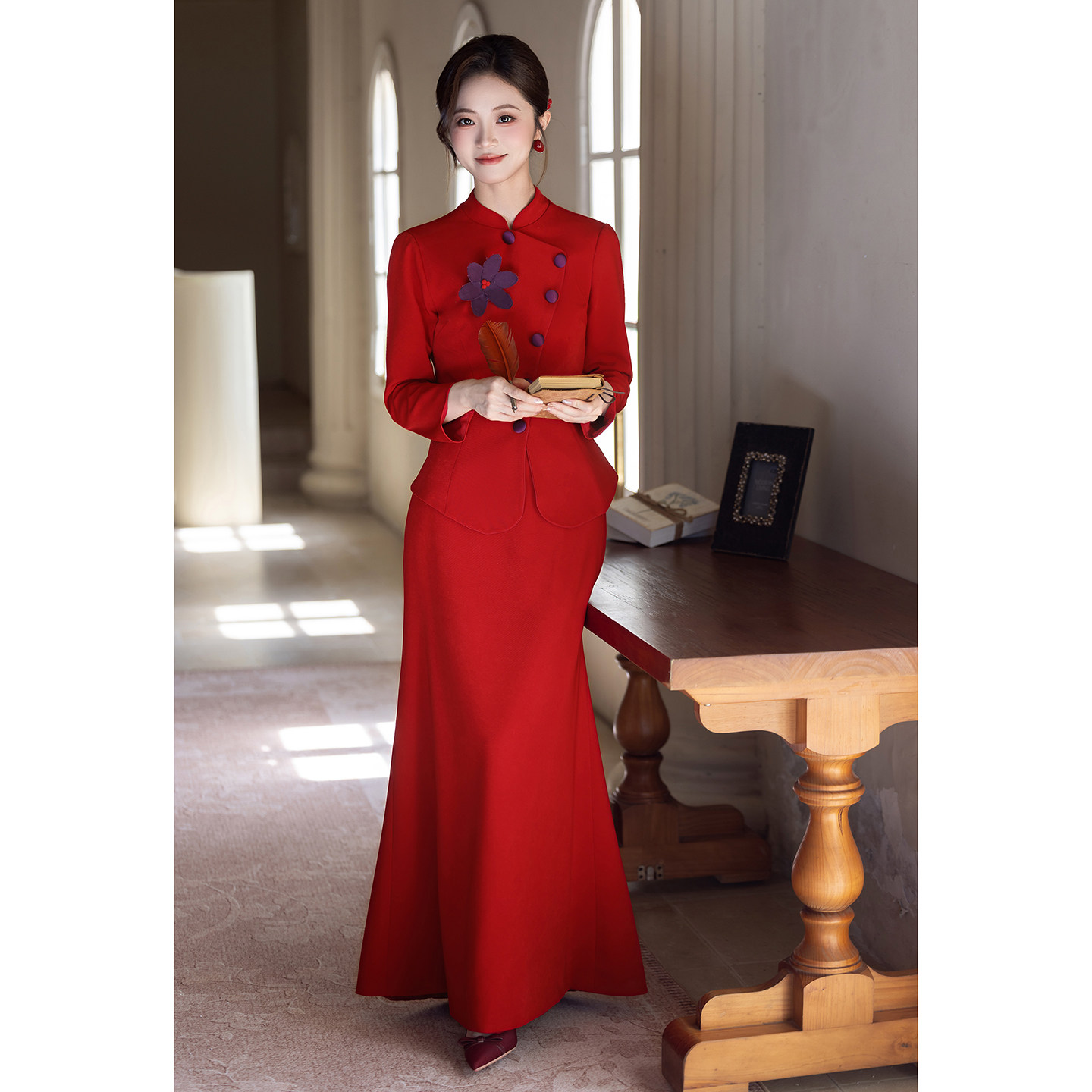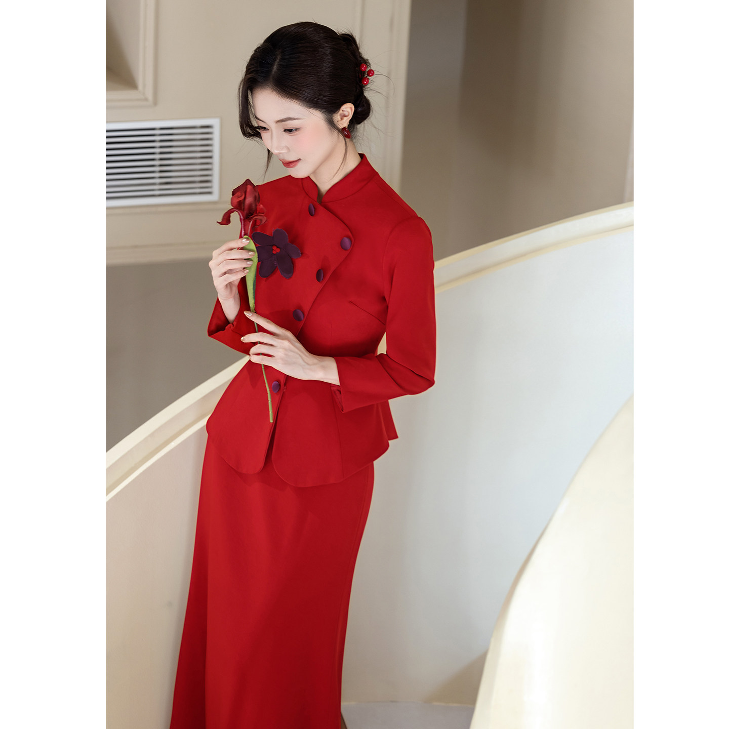 秋冬季 订婚礼服裙女敬酒服新娘结婚旗袍回门服长袖 红色套装 新中式