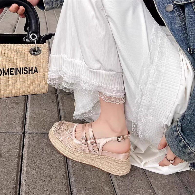小个子草编松糕底包头凉鞋 新款 女 2025夏季 透气网面厚底坡跟高跟鞋