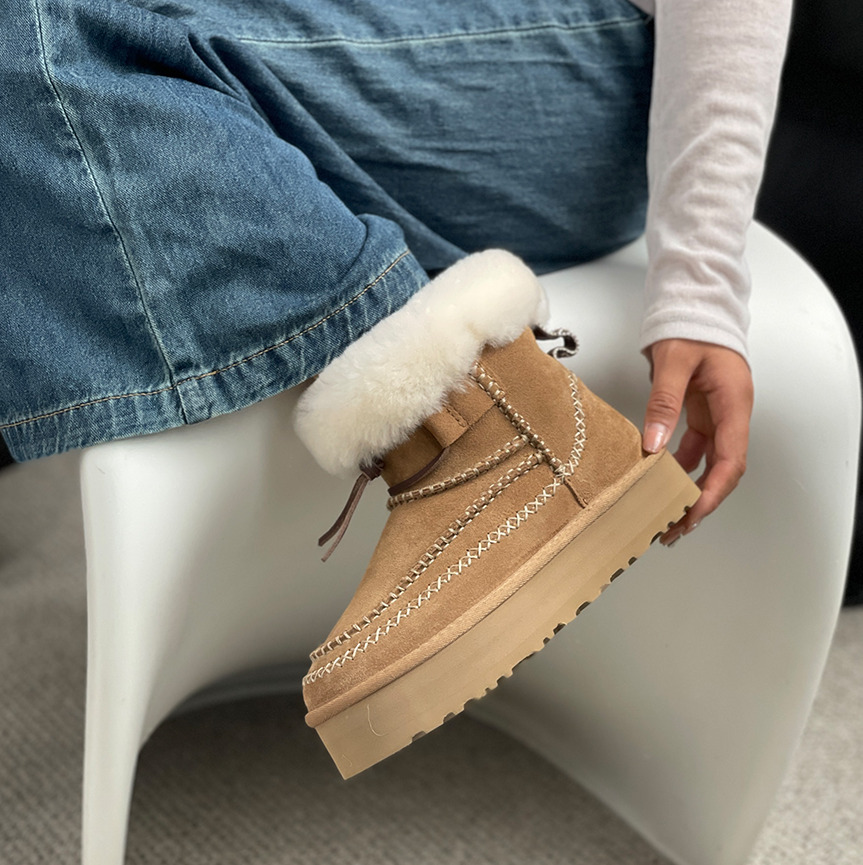 厚底阿尔派雪地靴女短靴羊毛拖鞋 一脚蹬 皮毛一体民族风中筒懒人鞋