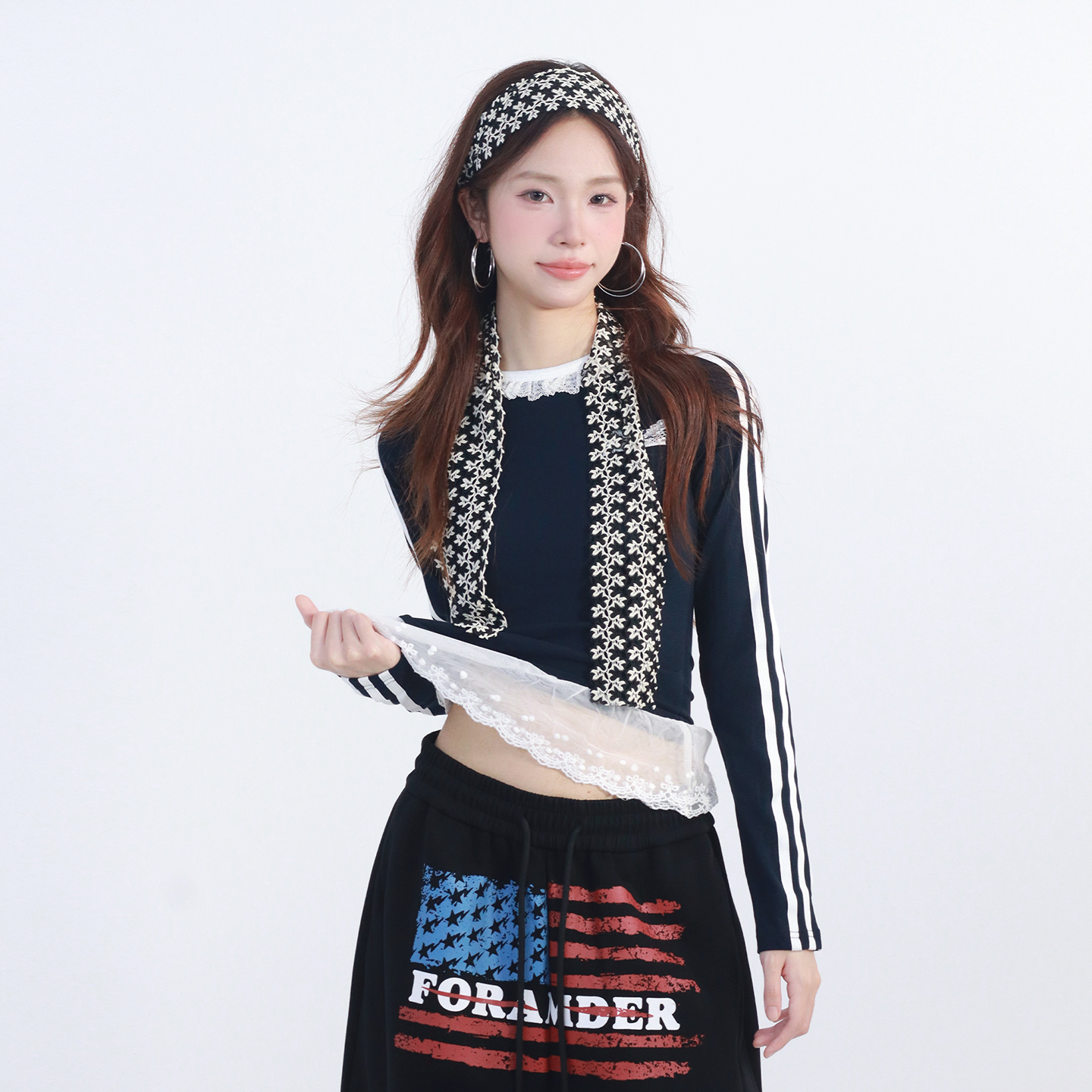 辣妹上衣女TX326 T恤修身 大佬街舞潮牌美式 复古蕾丝撞色拼接长袖