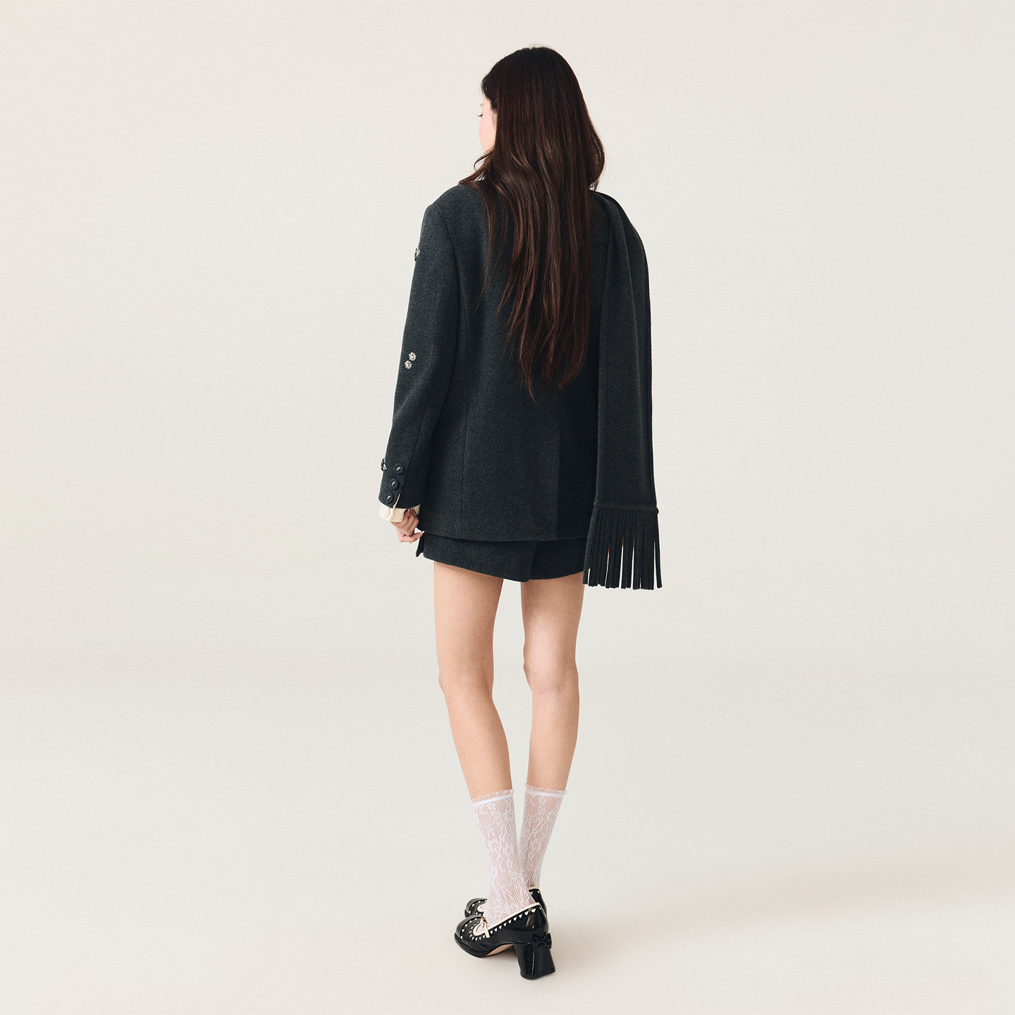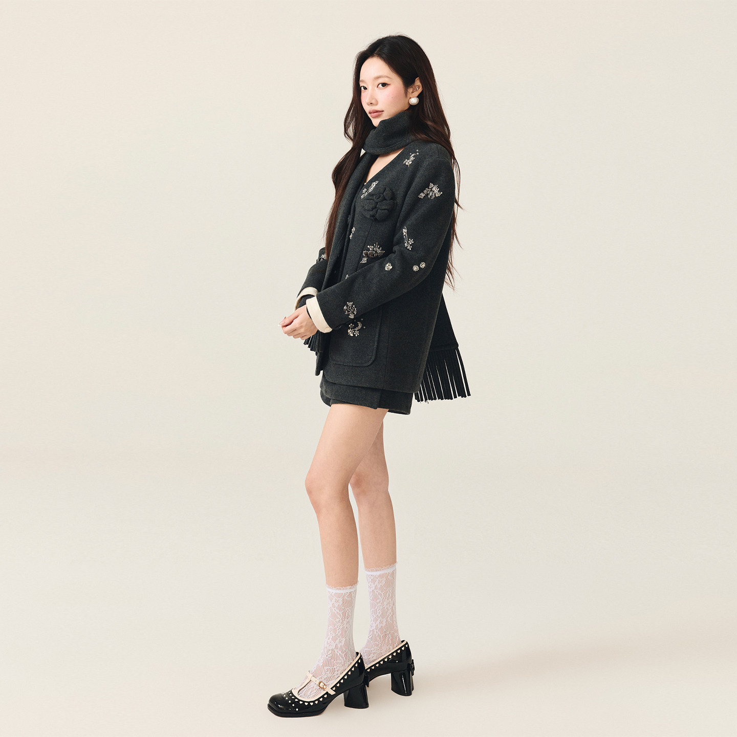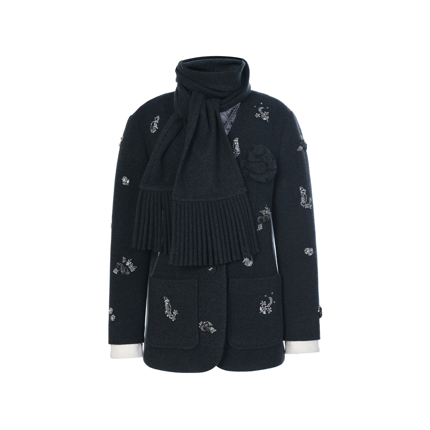 lefame拉飞姆绵羊毛猫咪珠饰毛呢外套上衣配围巾