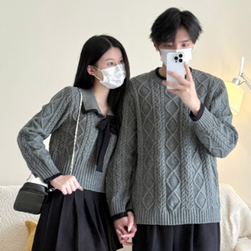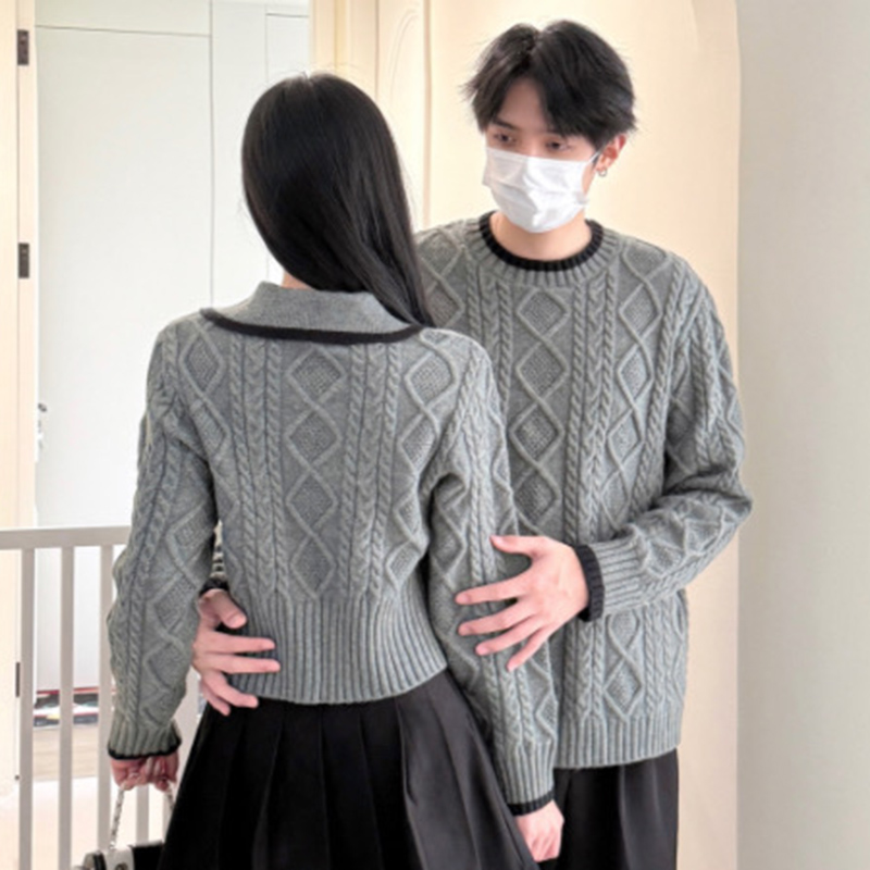 灰色毛衣一长一短设计感娃娃领蝴蝶结高级感针织衫 情侣装 秋冬新款