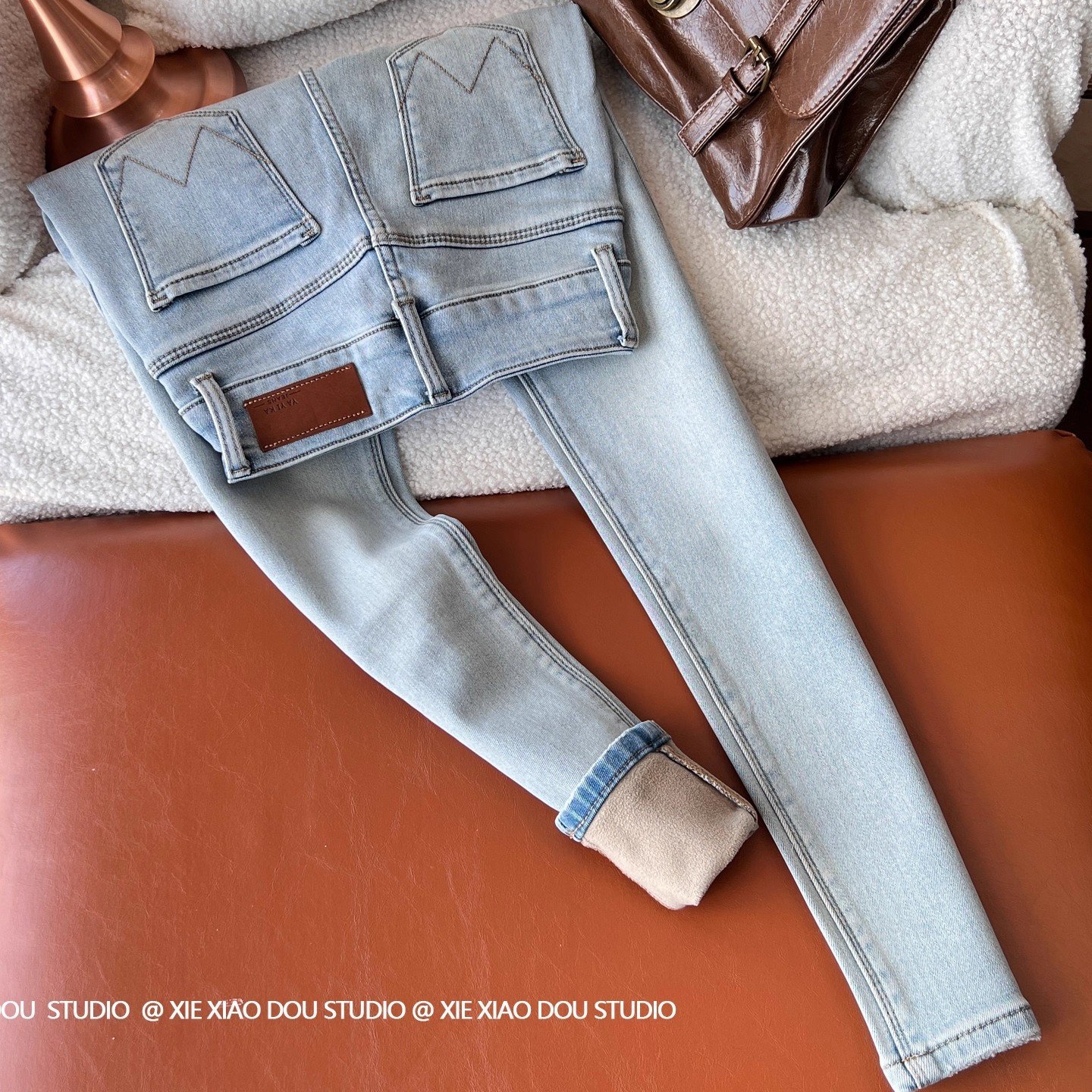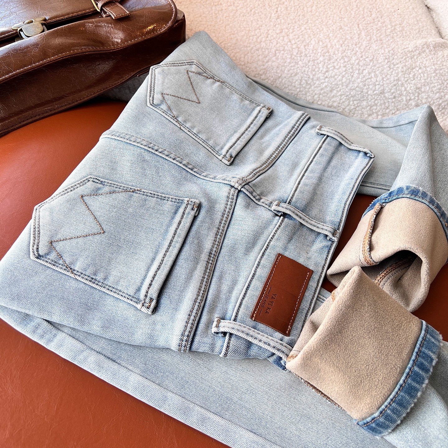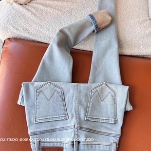 加厚保暖弹力烟管法棍裤 小个子bi入巨显瘦水貂绒直筒牛仔裤 女冬季