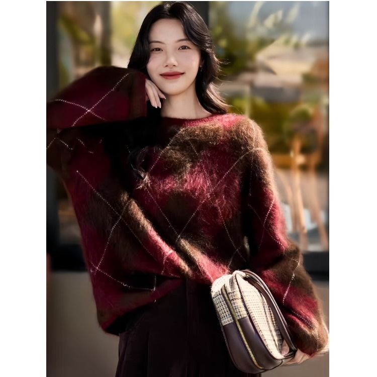 宽松慵懒风圆领上衣 毛衣女秋冬时尚 法式 高级感撞色菱格软糯针织衫