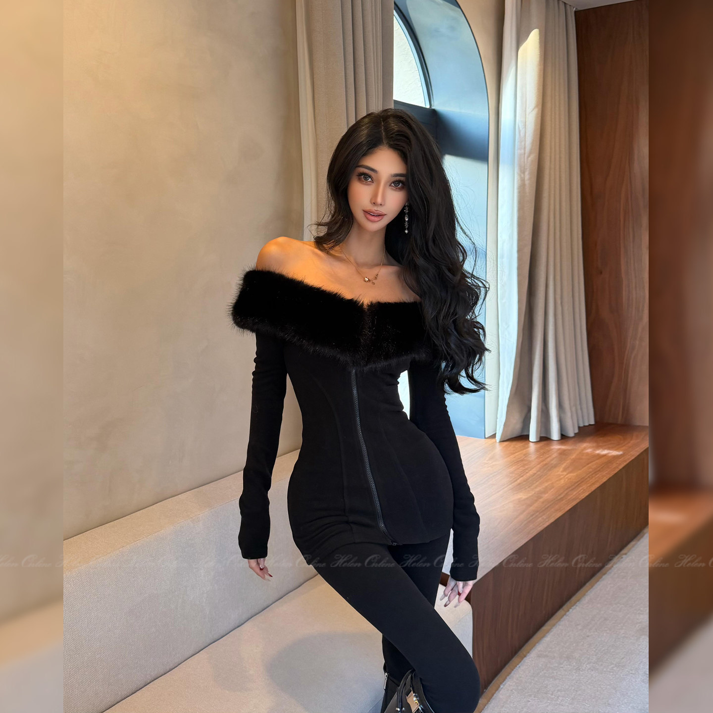 套装 HELEN 小脚裤 氛围感两件套女毛领露肩包臀开衫 莱赛尔暖姜绒