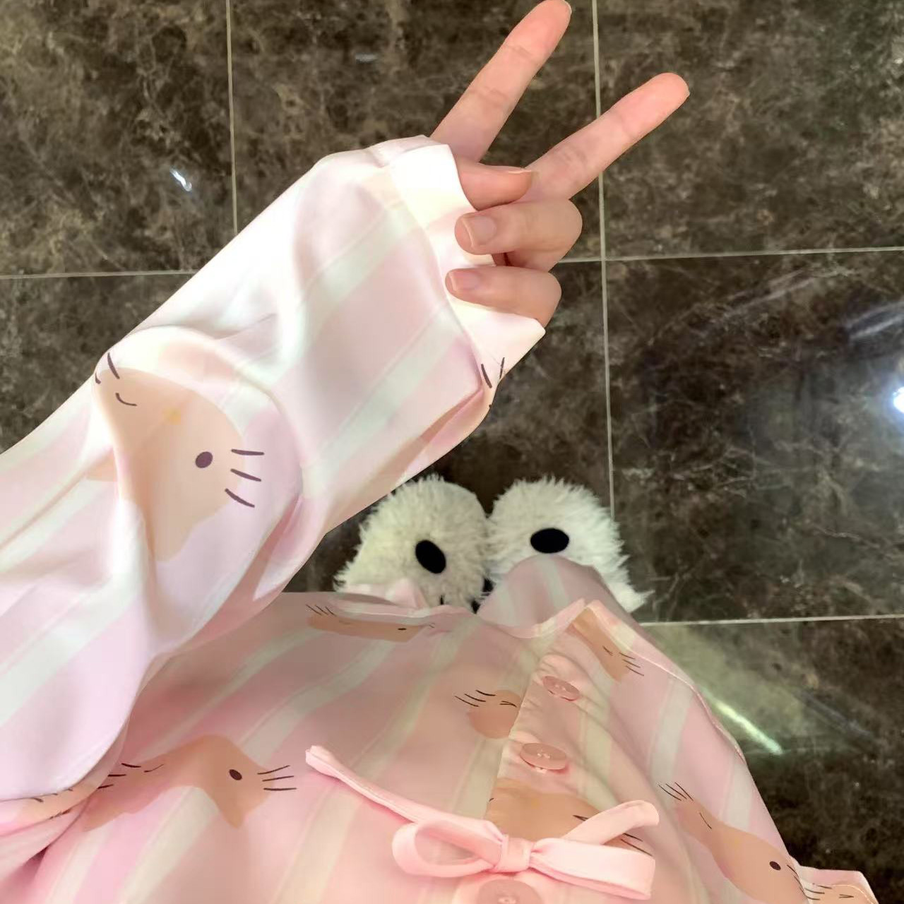 睡衣女套装 卡通冰丝夏季 家居服黑皮kitty脑袋长袖 侘町2025年新款