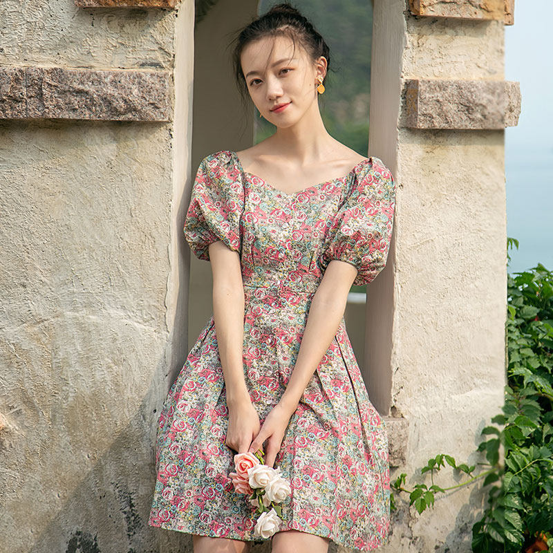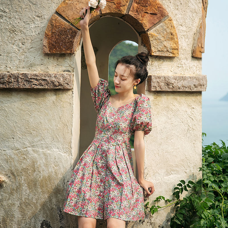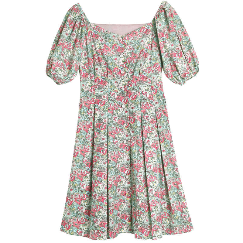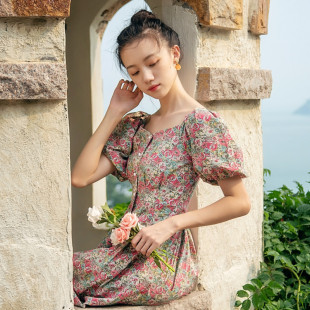 2024新款 棉质碎花裙子女夏装 连衣裙短袖 微笑向暖复古方领花色法式