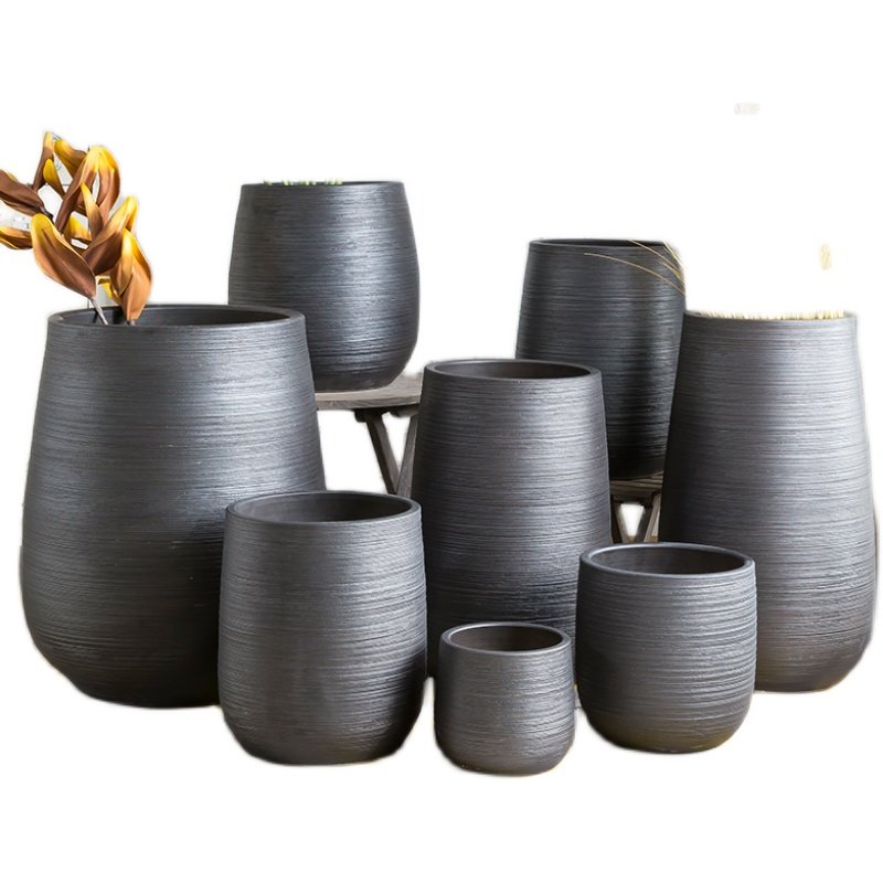 简约黑白色陶瓷花盆素烧有孔花盆多肉阳台种花大口径陶盆带托盘