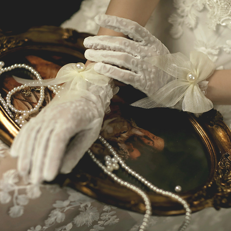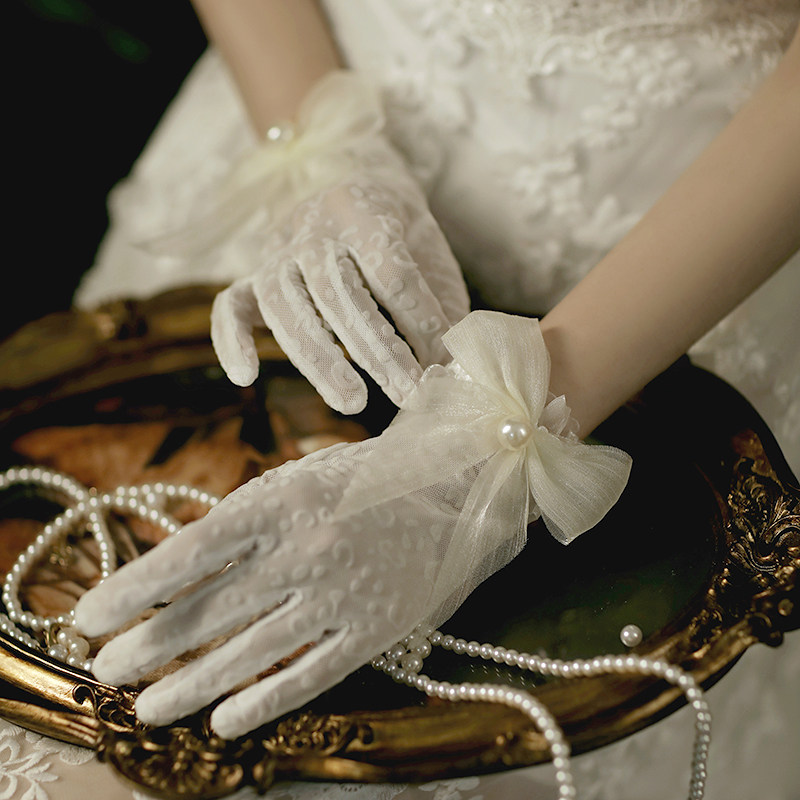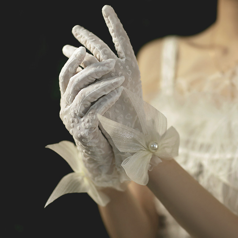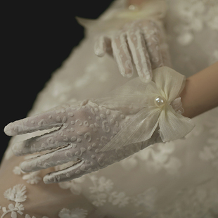 蕾丝蝴蝶结手套白色网格礼服新娘结婚纱网红生日派对公主写真手袖