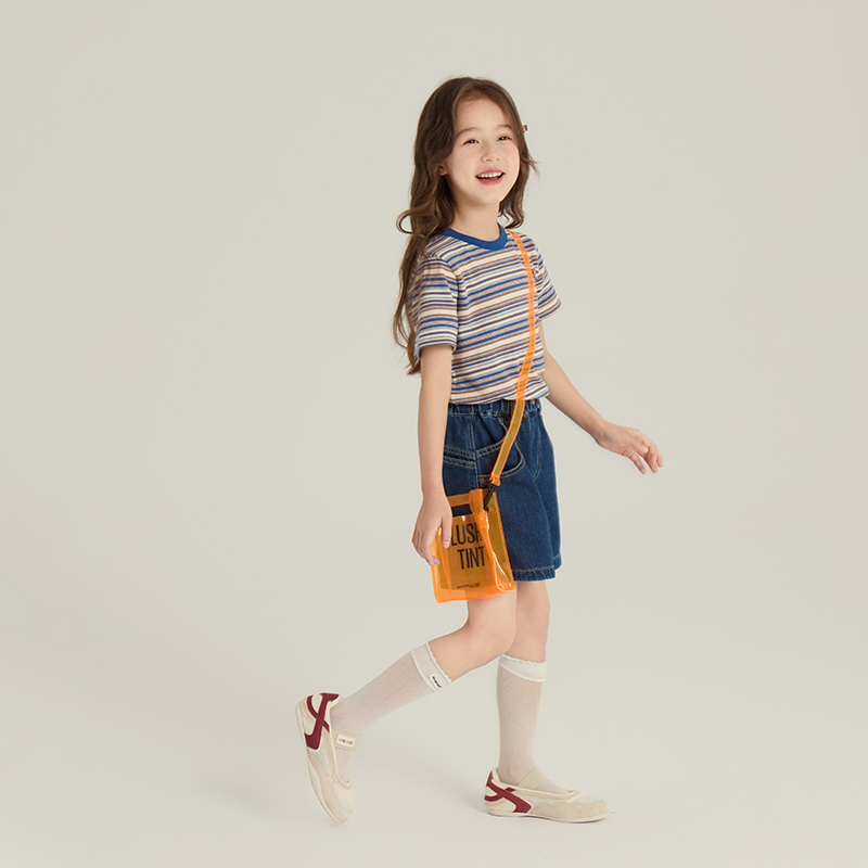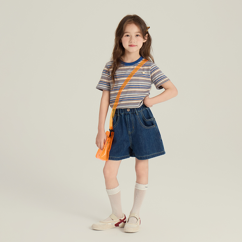 T恤中大童休闲百搭上衣儿童打底衫 依依妈童装 夏女童复古条纹短袖