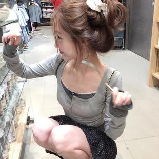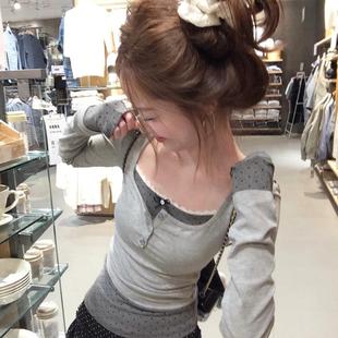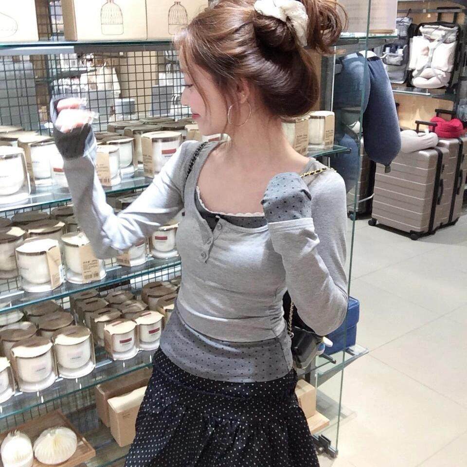 复古修身 新款 显瘦打底上衣 t恤女2025春季 甜美波点灰色假两件长袖