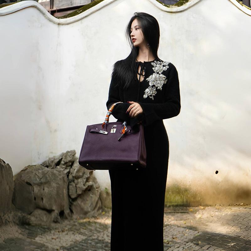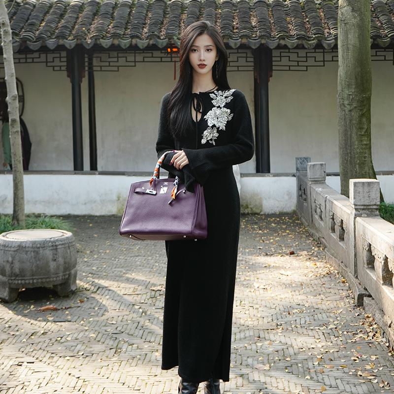 玛瑙黑羊毛针织重工珠片刺绣连衣裙 新中式 澄渔高定 琉璃如羡