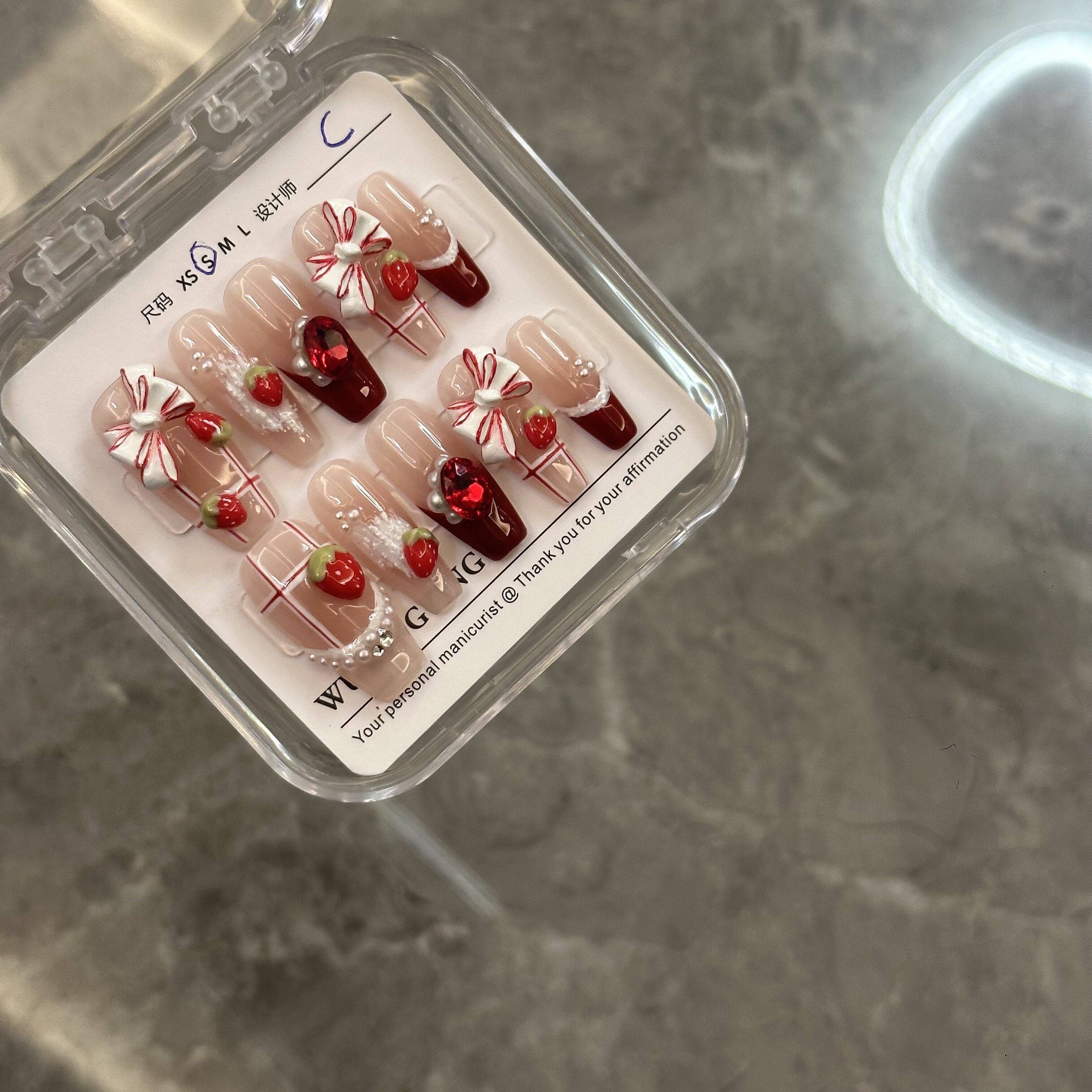 手工定制红白格纹立体桃心美甲成品贴片穿戴甲假指甲持久可拆卸