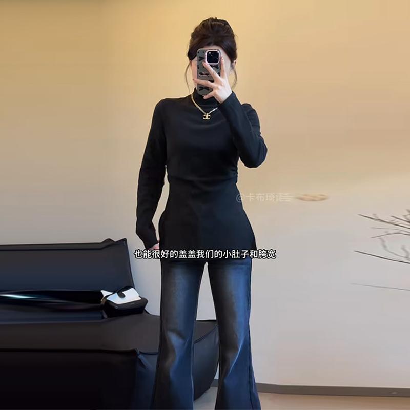 T恤褶皱收腰别致上衣潮 女秋冬显瘦修身 大码 胖MM内搭半高领打底衫