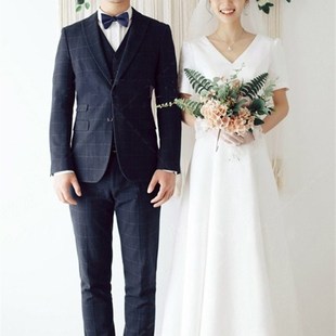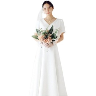 森系旅拍轻婚纱超仙新娘V领白色简约韩版 缎面气S质显瘦轻纱出门纱