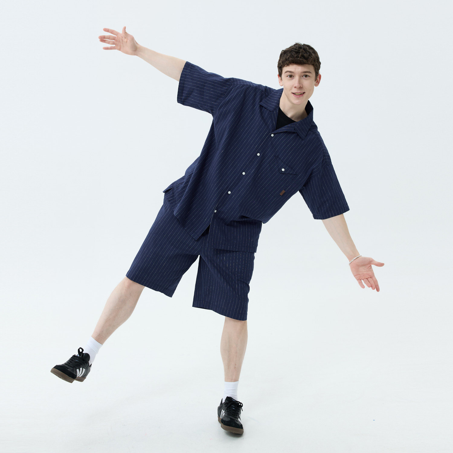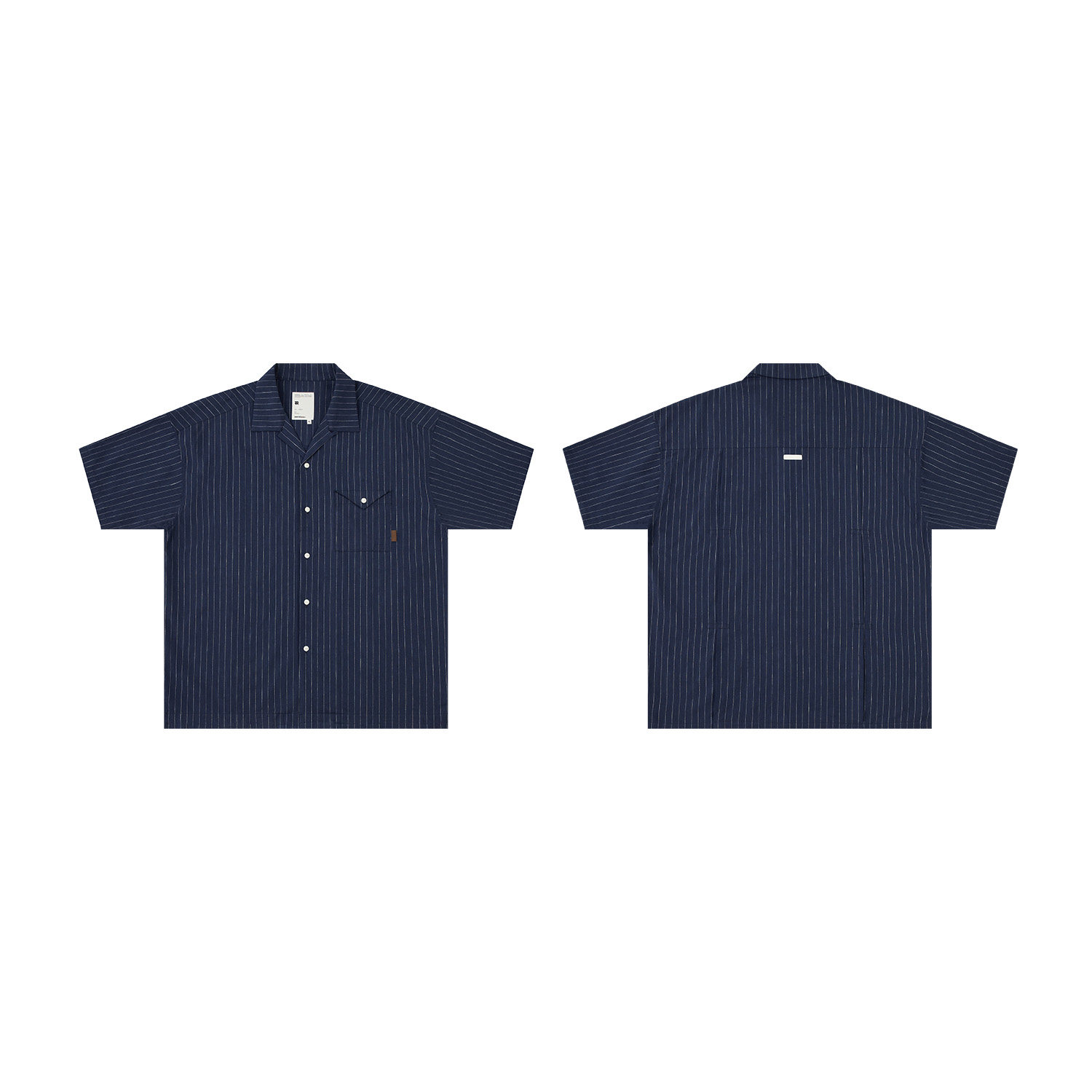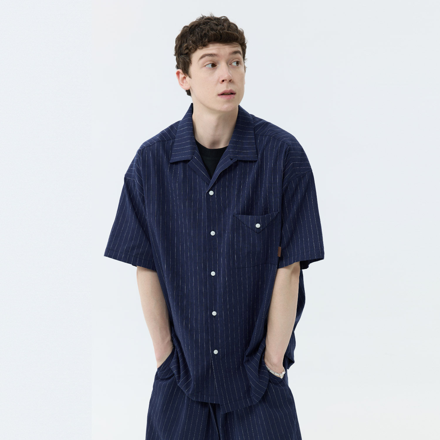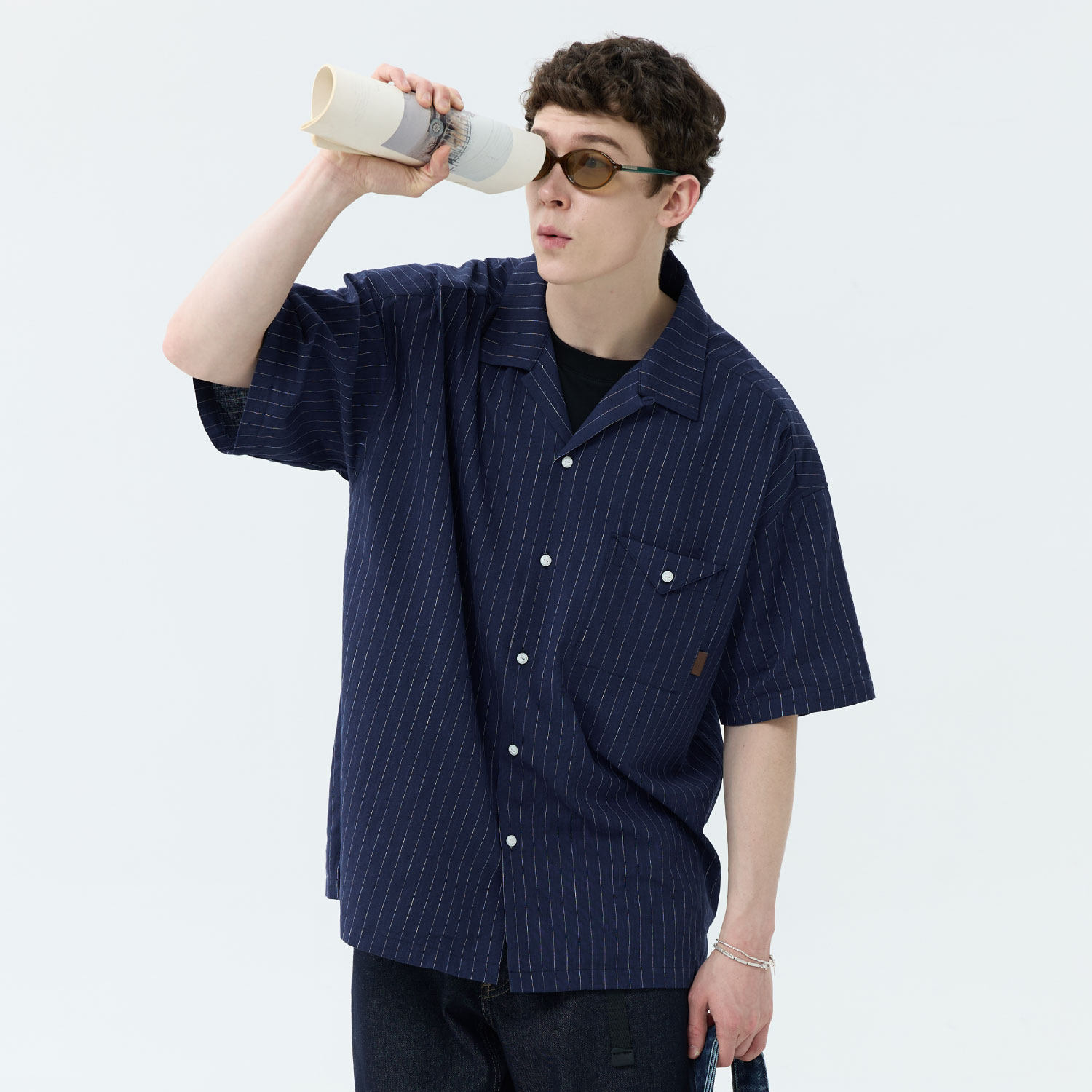 衬衫 warmtrees 上衣度假风亚麻藏青竖条纹短袖 夏季 2025新款