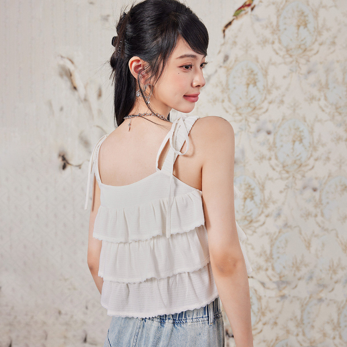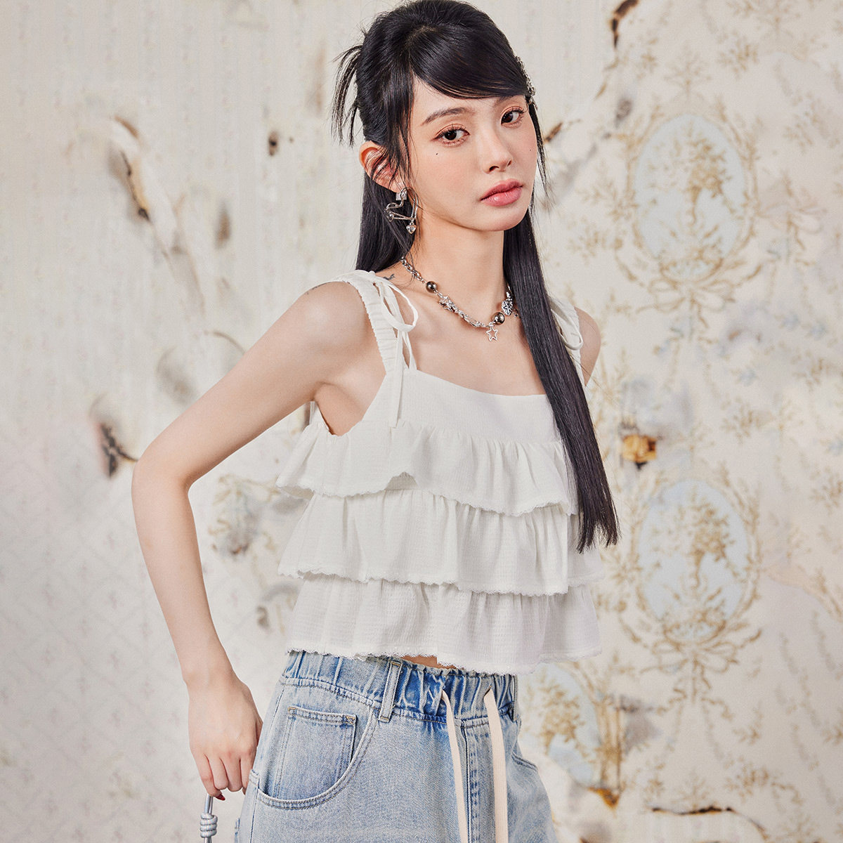 上衣女 CRAWFISH浪漫甜美多层抽褶荷叶花边双肩带a字显瘦吊带衫