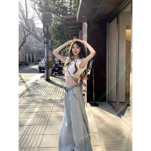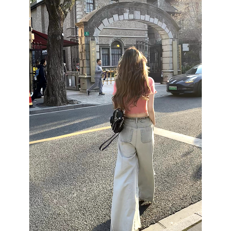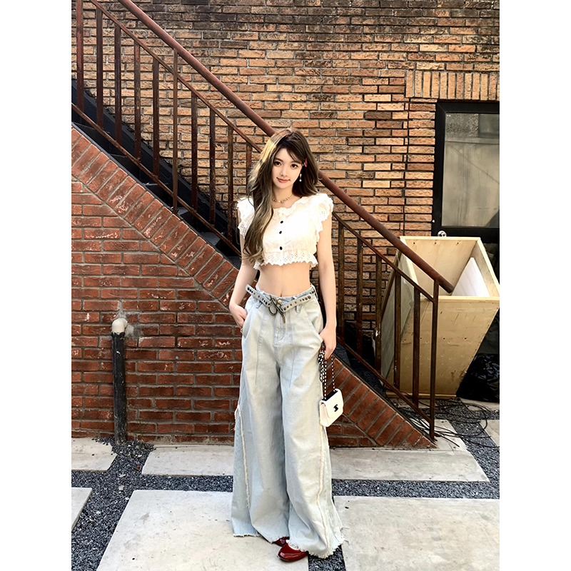 高腰牛仔裤 RomanLand 女夏季 水洗做旧阔腿裤 宽松显瘦拖地裤