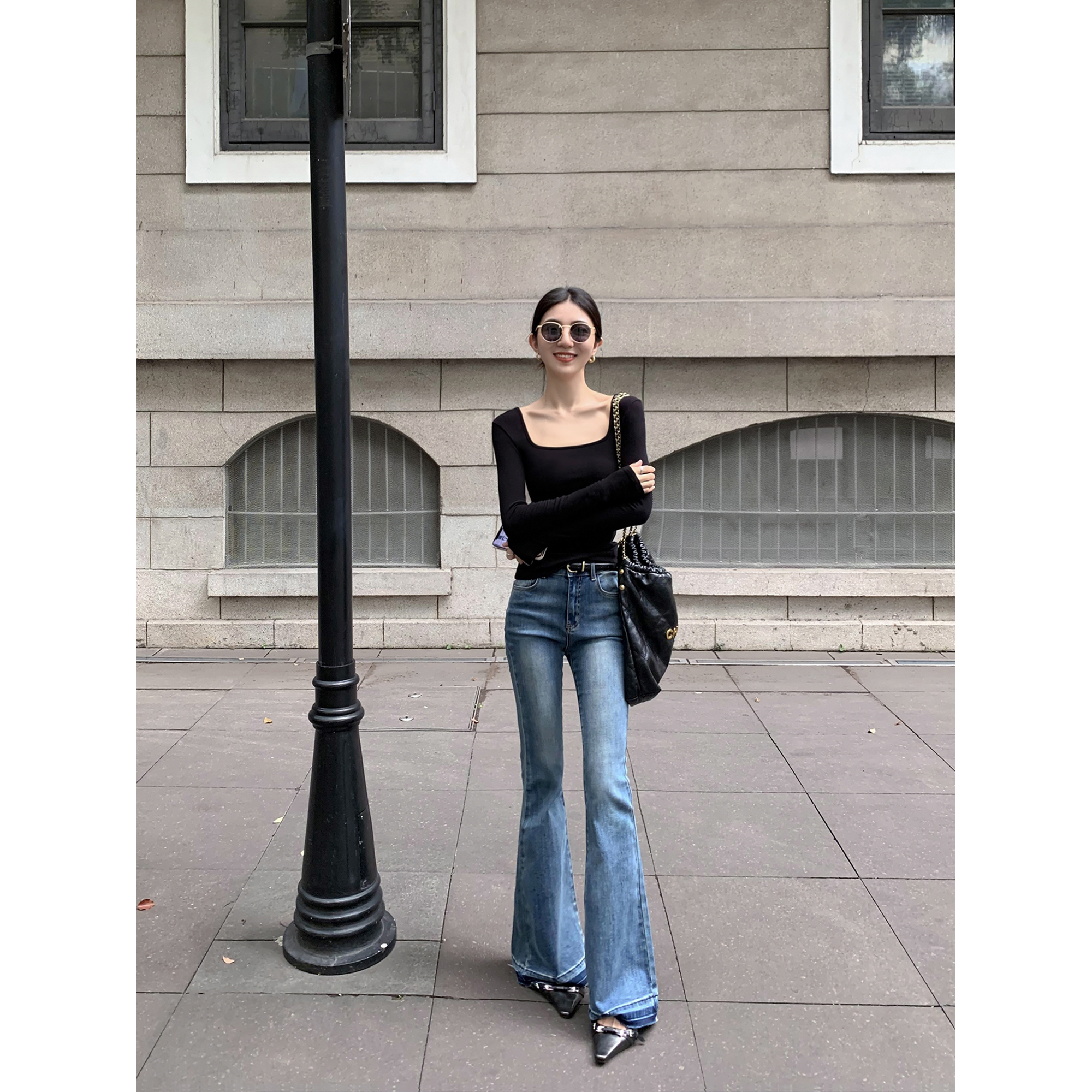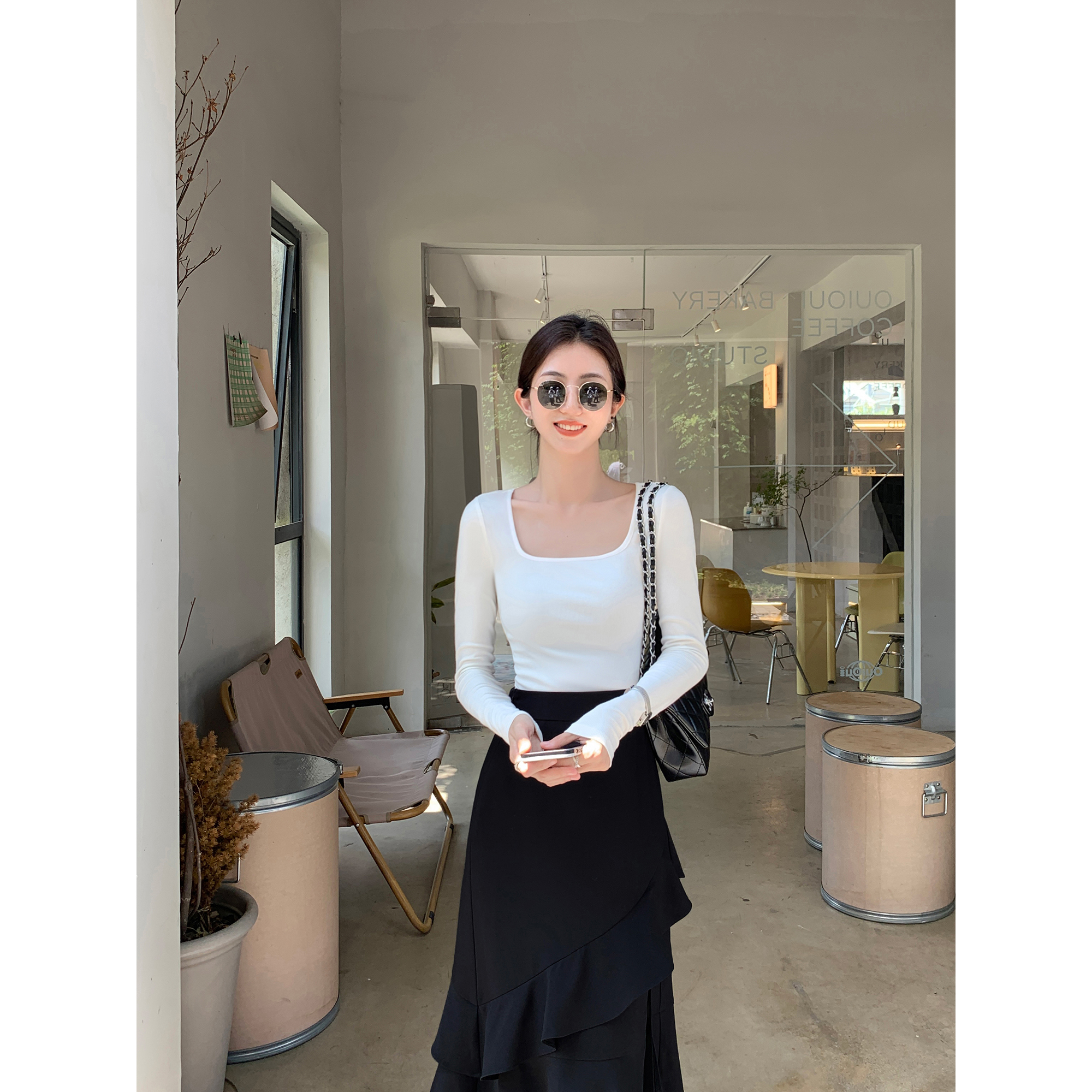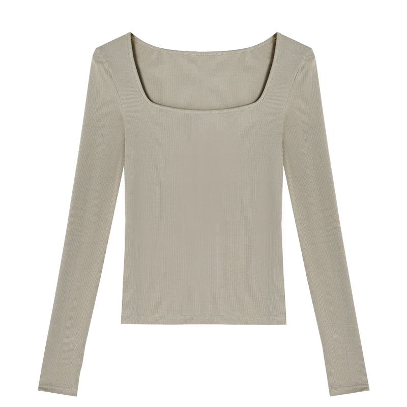 显瘦内搭露锁骨打底衫 针织t恤女秋冬修身 上衣 黑色方领长袖 MULVAN