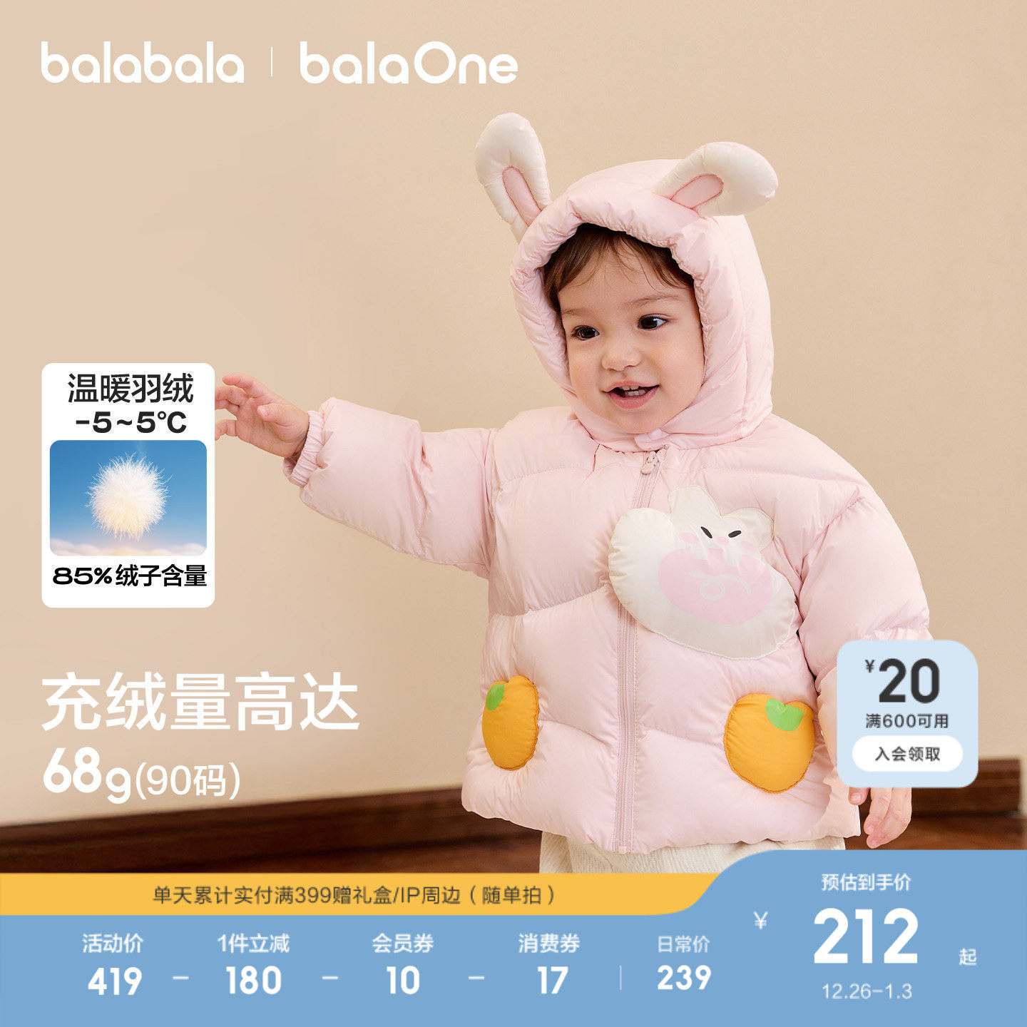 加厚保暖宝宝儿童2025新款 巴拉巴拉童装 婴儿羽绒服女男童外套冬装