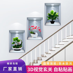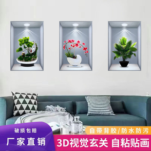 新款 饰自粘画 3D立体墙贴画仿真效果盆栽贴画客厅过道三联玄关装