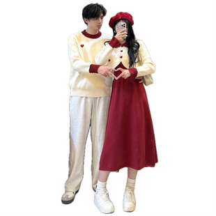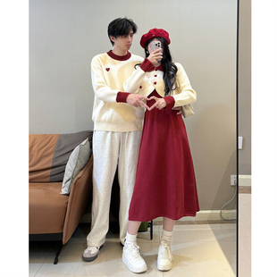 针织衫 法式 潮 秋冬ins超火毛衣连衣裙一男一女韩版 跨年红色情侣装