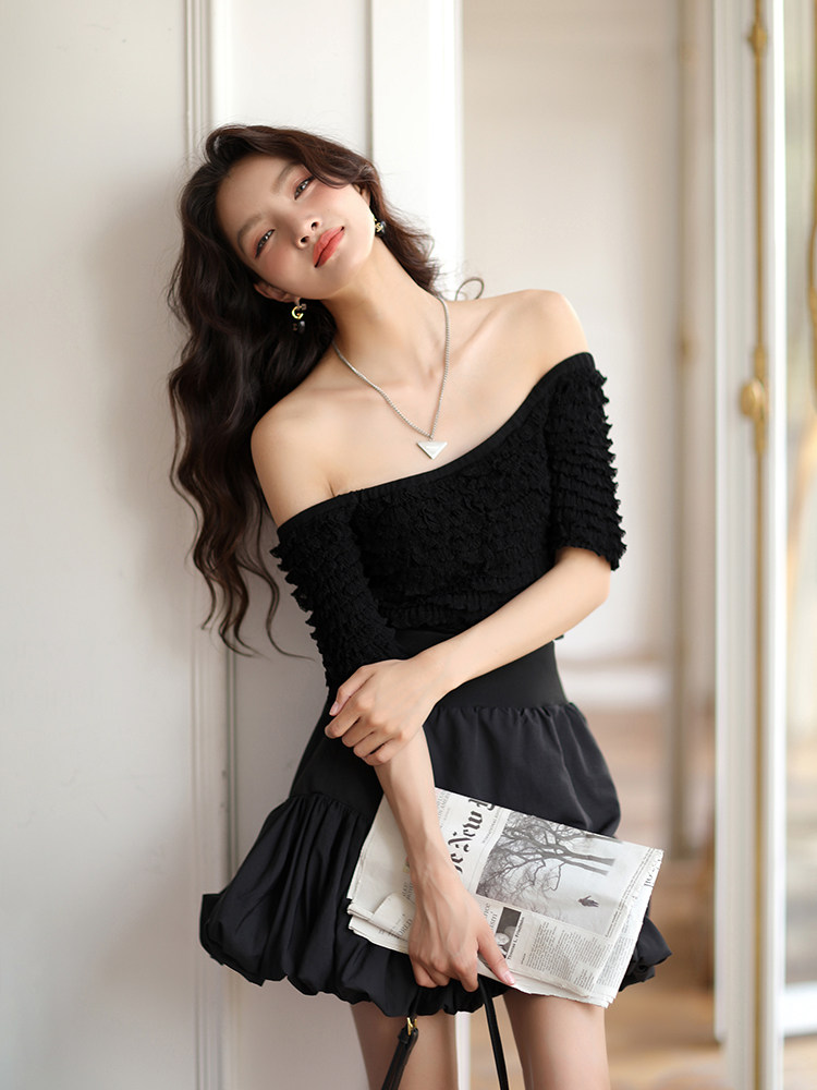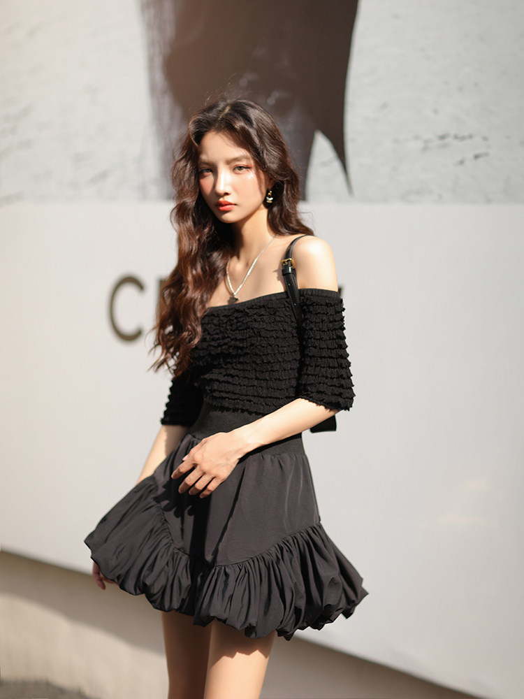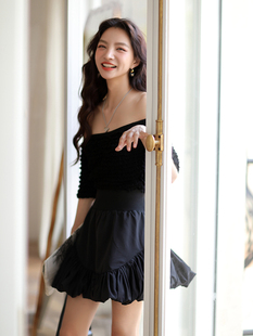 CAN夏季 抽褶泡泡裙高腰显瘦黑色半身裙短裙女小众设计感 新款