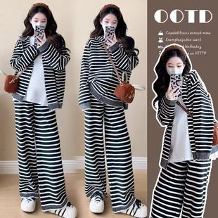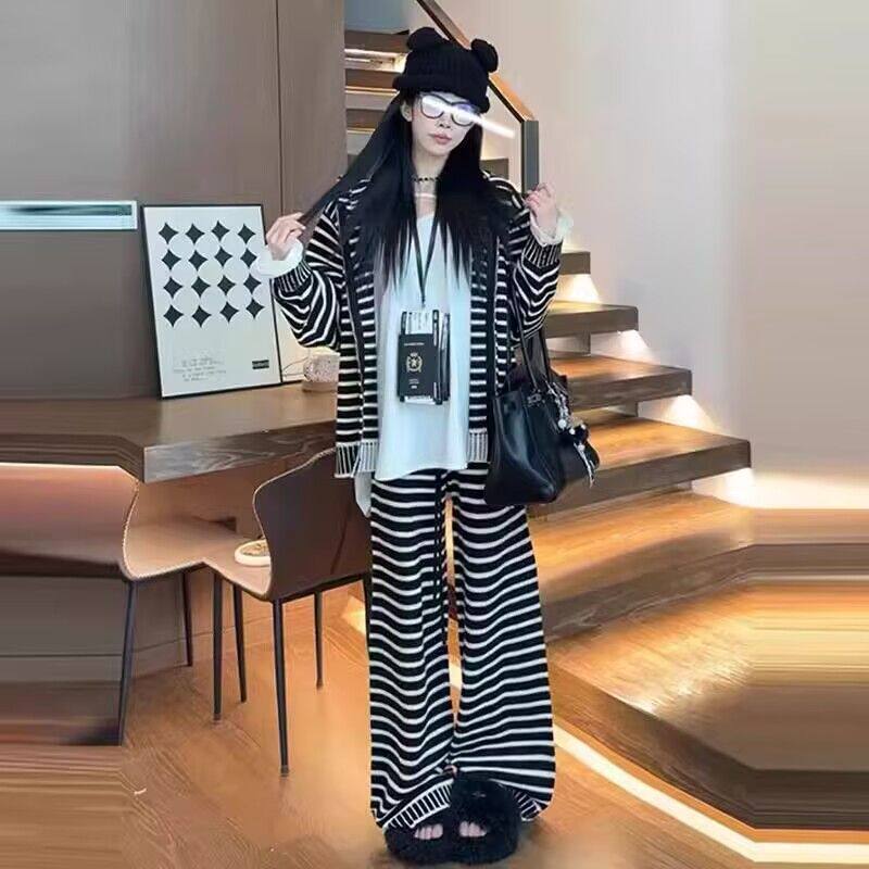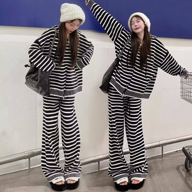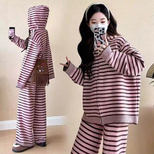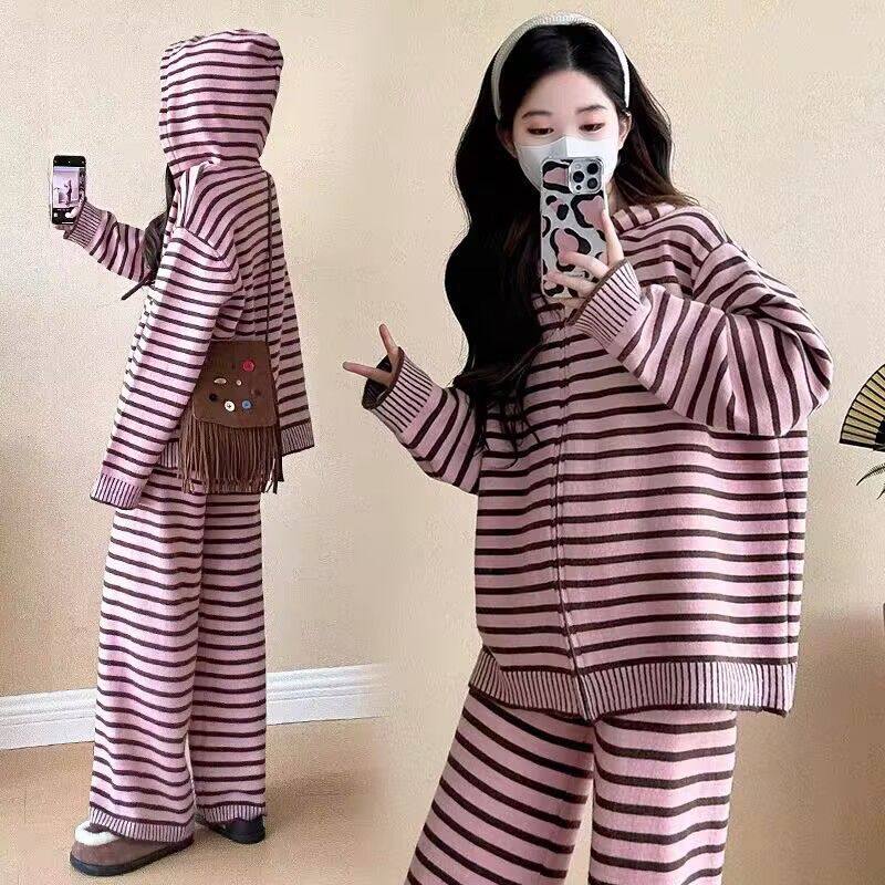 两件套 女2025春秋连帽条纹针织外套阔腿裤 韩系慵懒风时尚 休闲套装