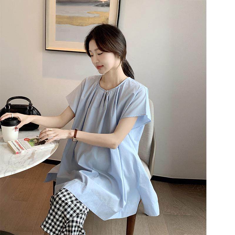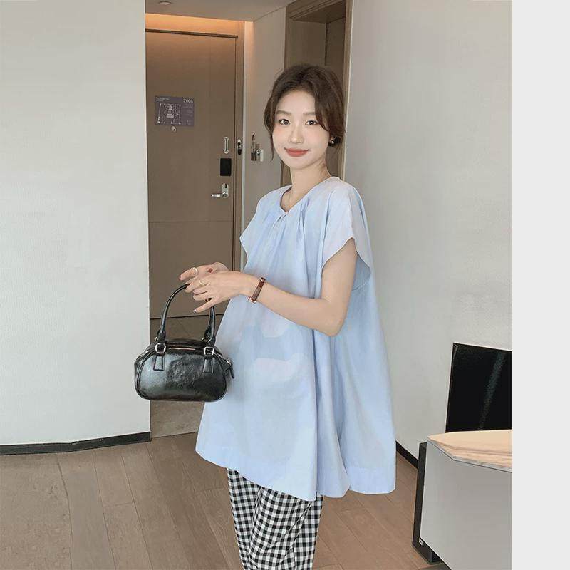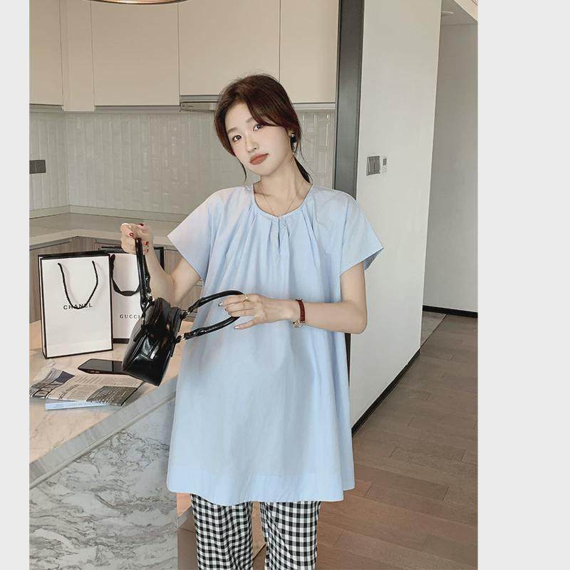 娃娃衫 夏季 大码 宽松遮肚白色孕妇装 t恤衬衣 蓝色 夏装 孕妇衬衫