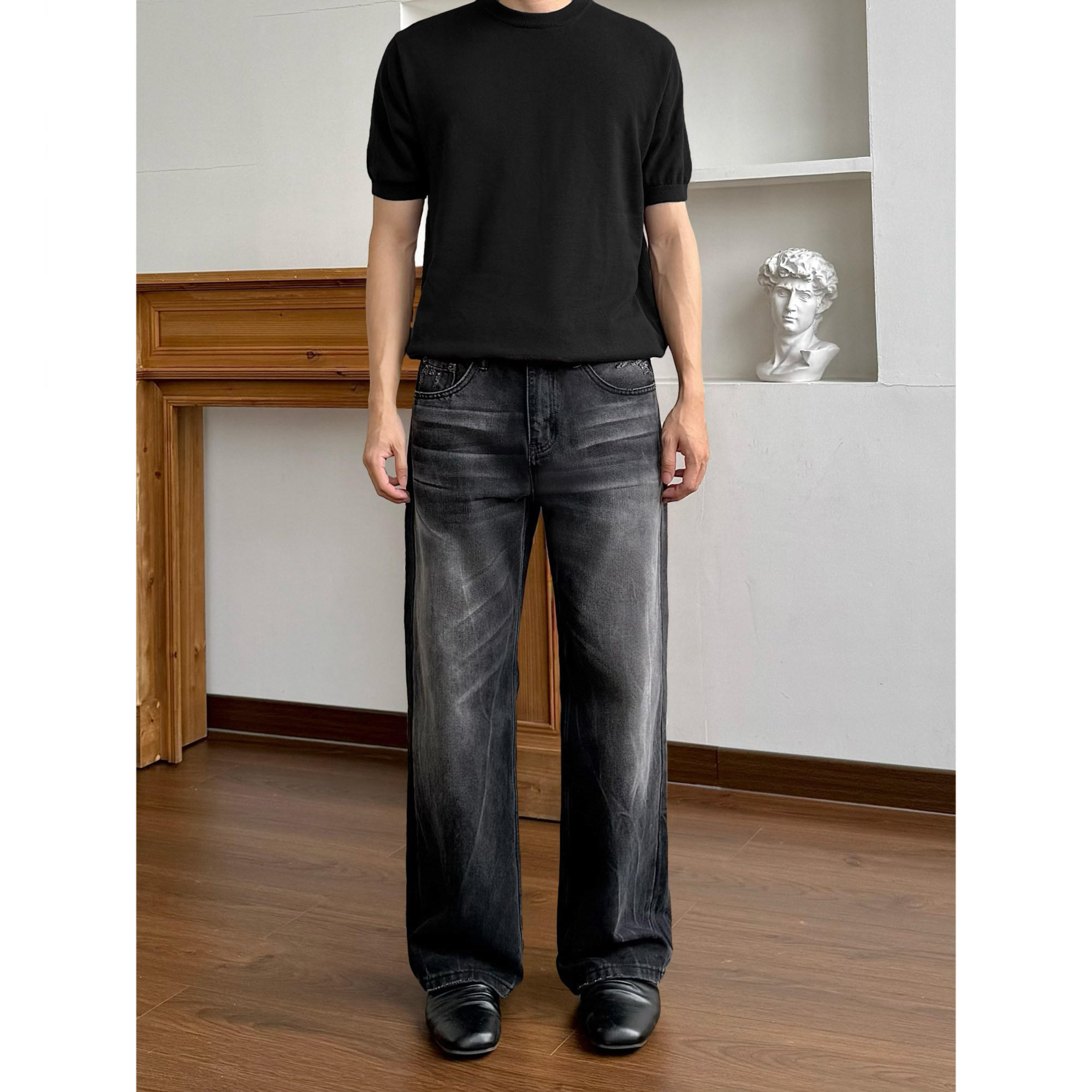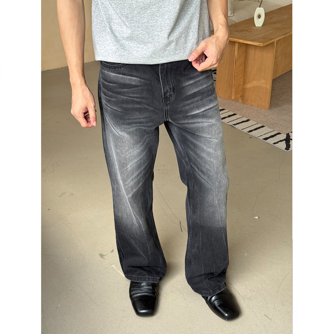 直筒微喇叭磨破洞百搭长裤 闪电裂纹水洗黑牛仔裤 男 2021M ALLFIT