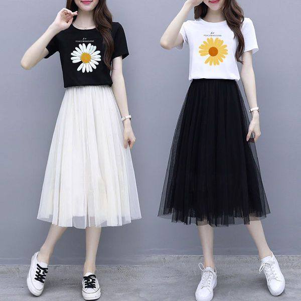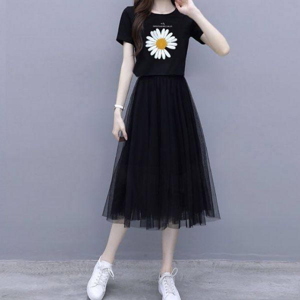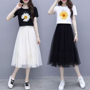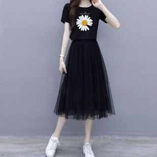 t恤两件套裙子网纱裙学生半身裙 2024新款 小个子连衣裙套装 女夏季