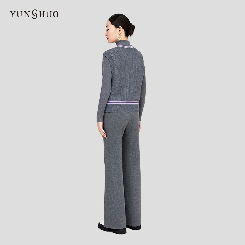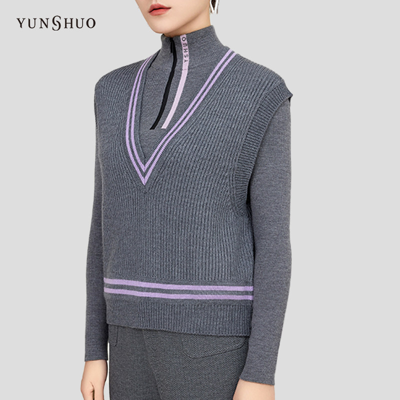 YUNSHUO新款 保暖背心条纹715067 绵羊毛针织马甲女V领无袖