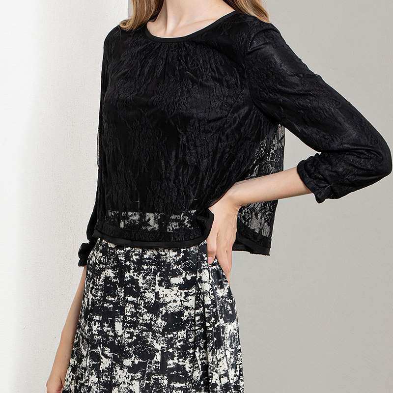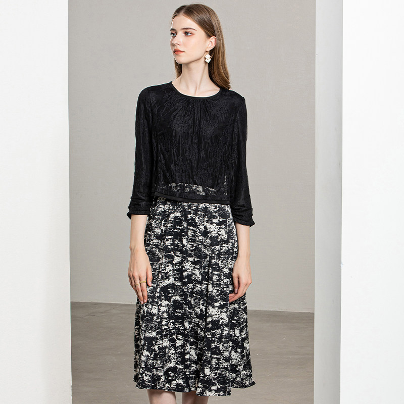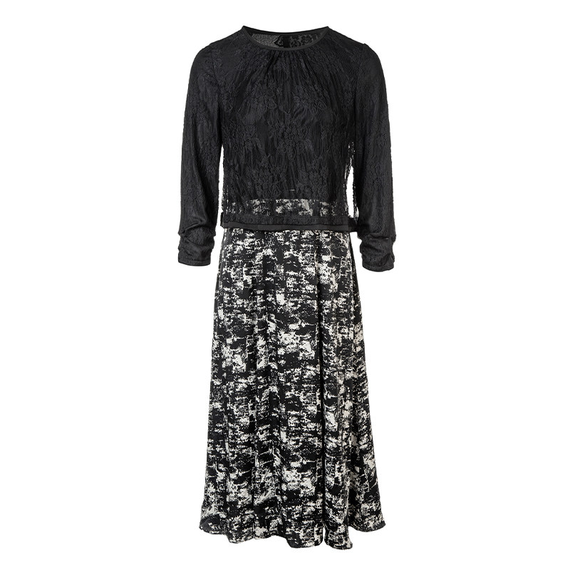 圆领 蕾丝印花中长裙七分袖 名师路假两件a字连衣裙女秋季 新款
