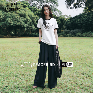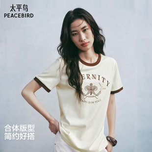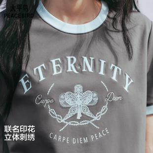 新款 T恤25夏季 圆领刺绣图案撞边上衣 太平鸟奶油棉短袖 张风野联名