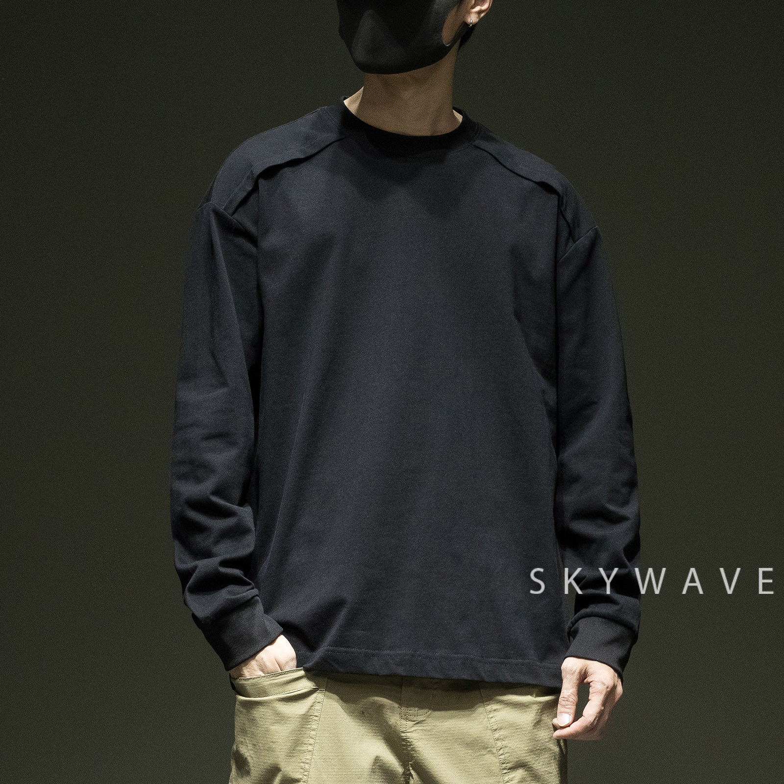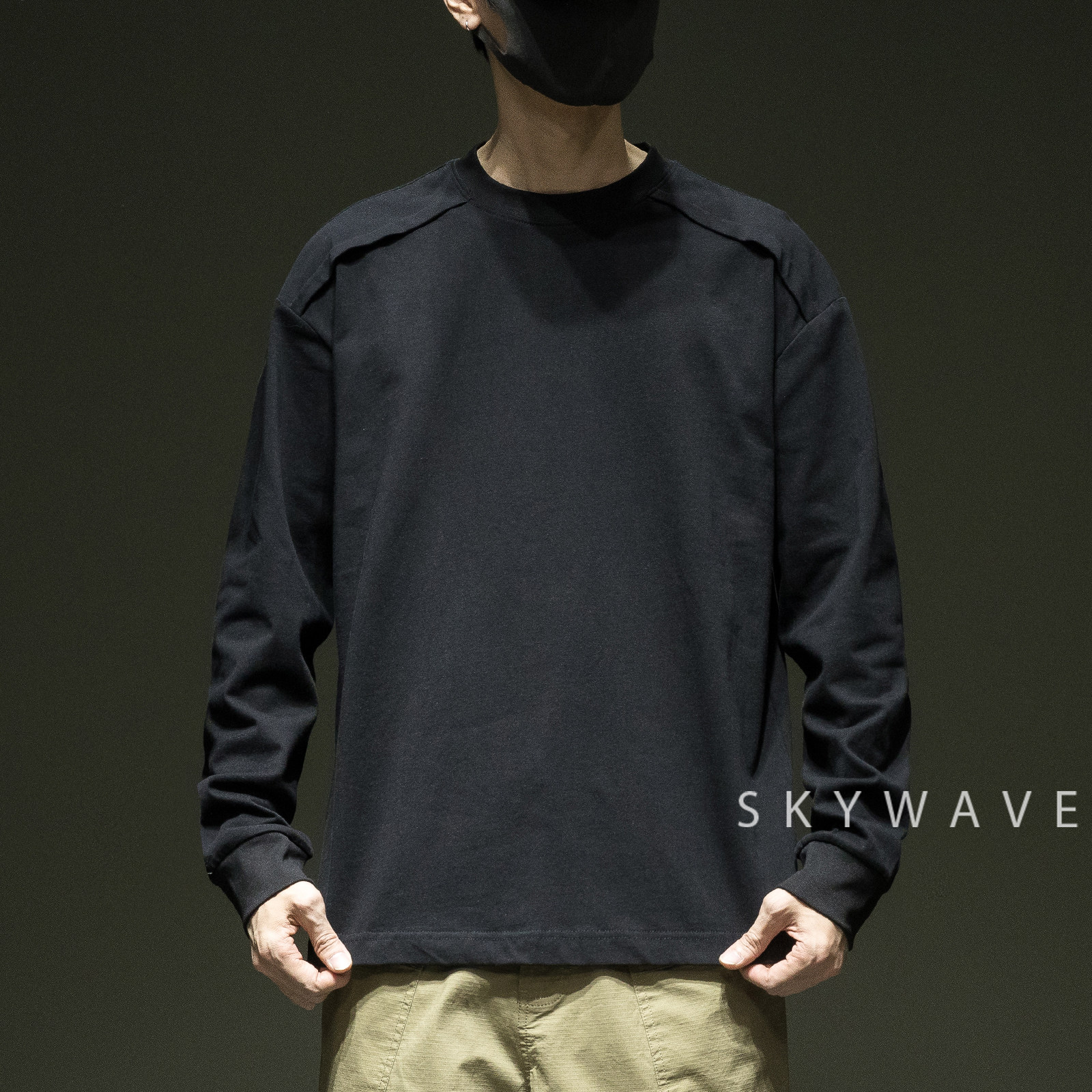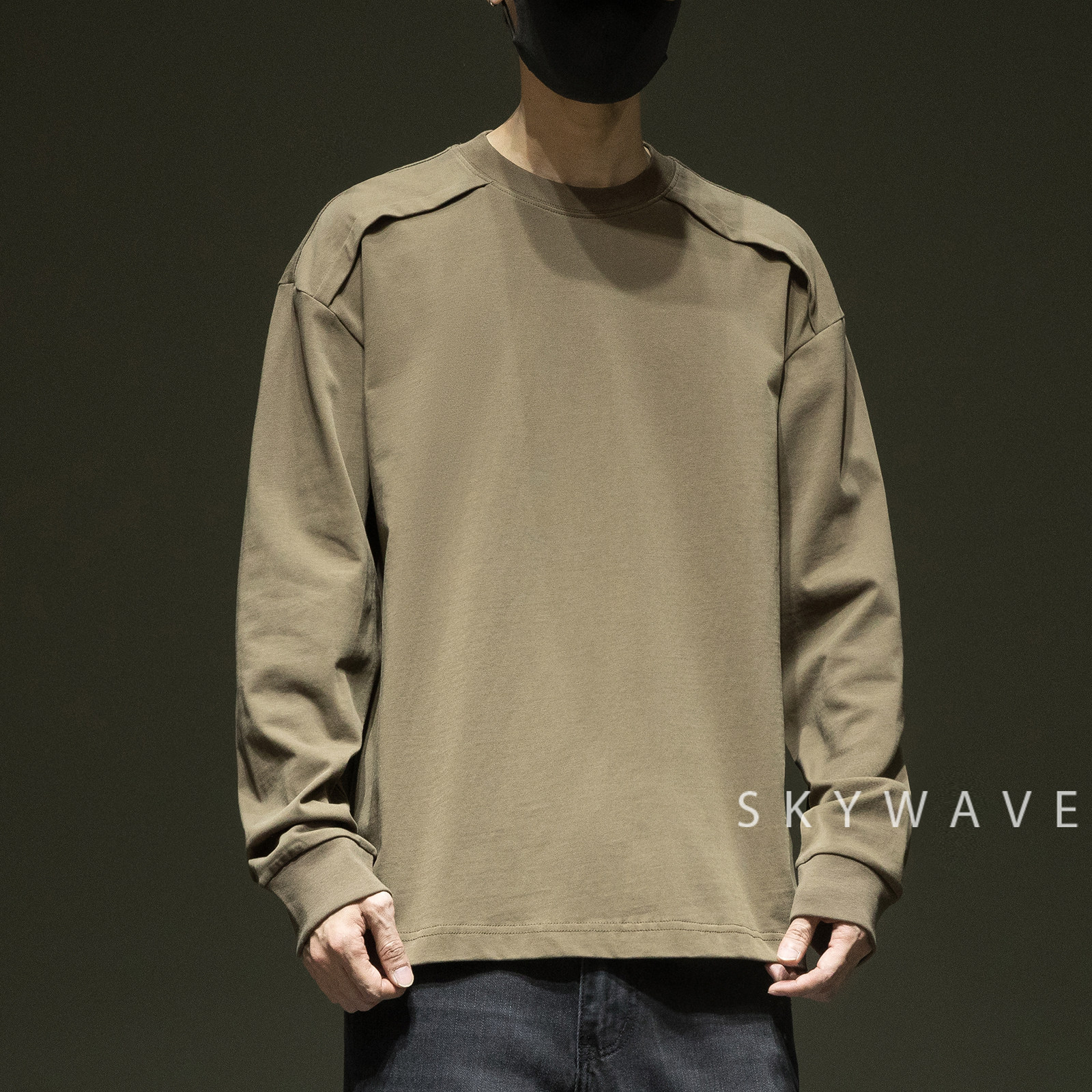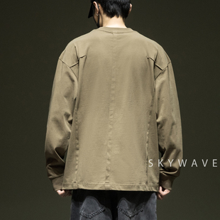 日系潮牌打底衫 美式 秋冬新款 t恤男宽松大码 圆领上衣 复古解构长袖