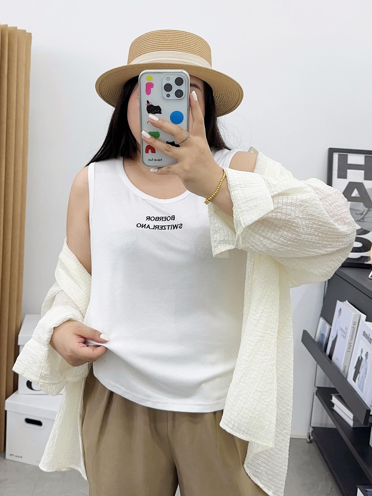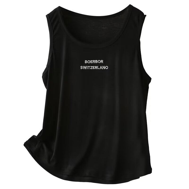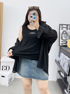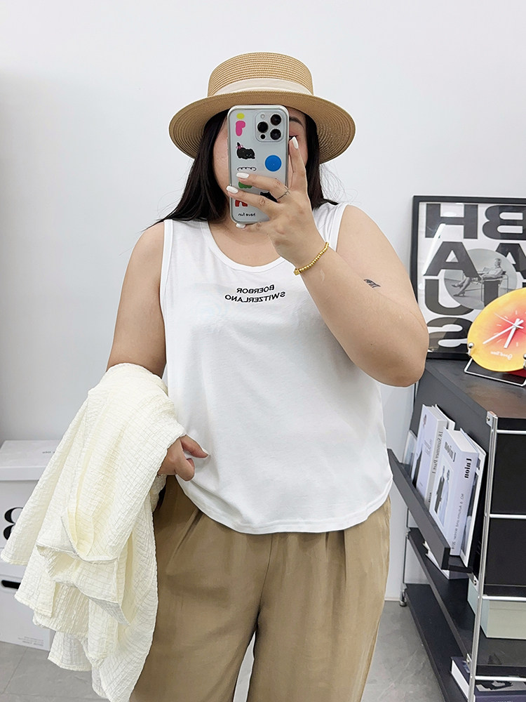 宛宛大码 女胖mm宽松休闲白色吊带背心内搭打底 字母刺绣遮肚子无袖